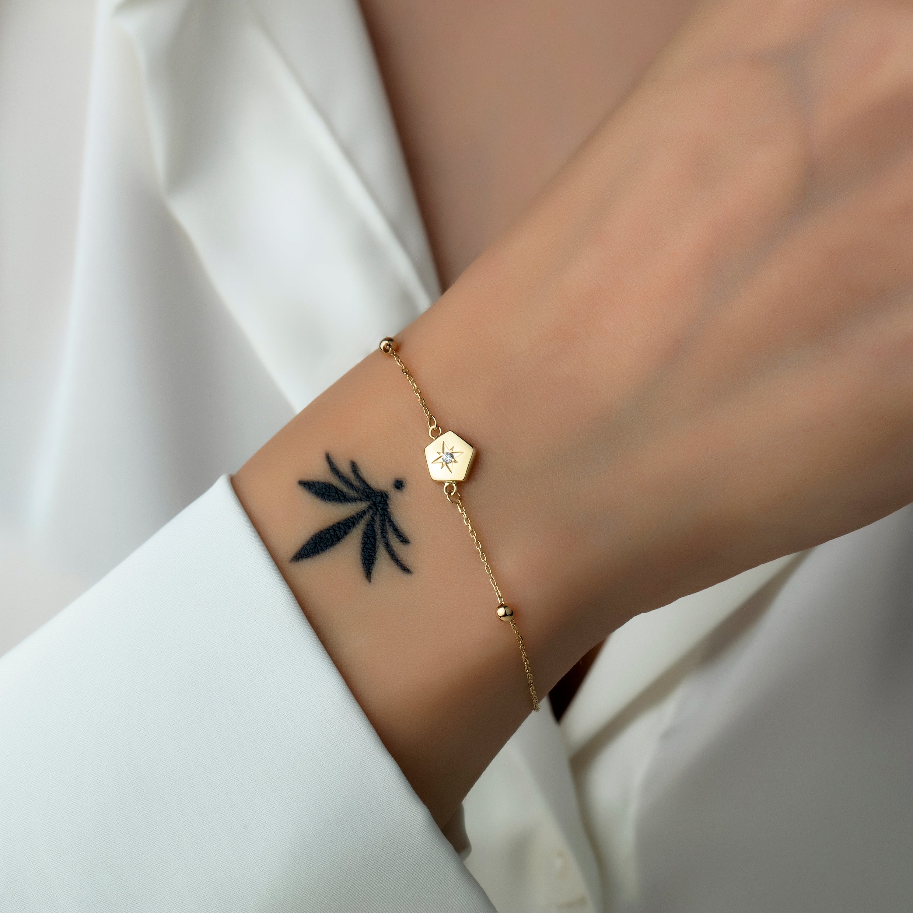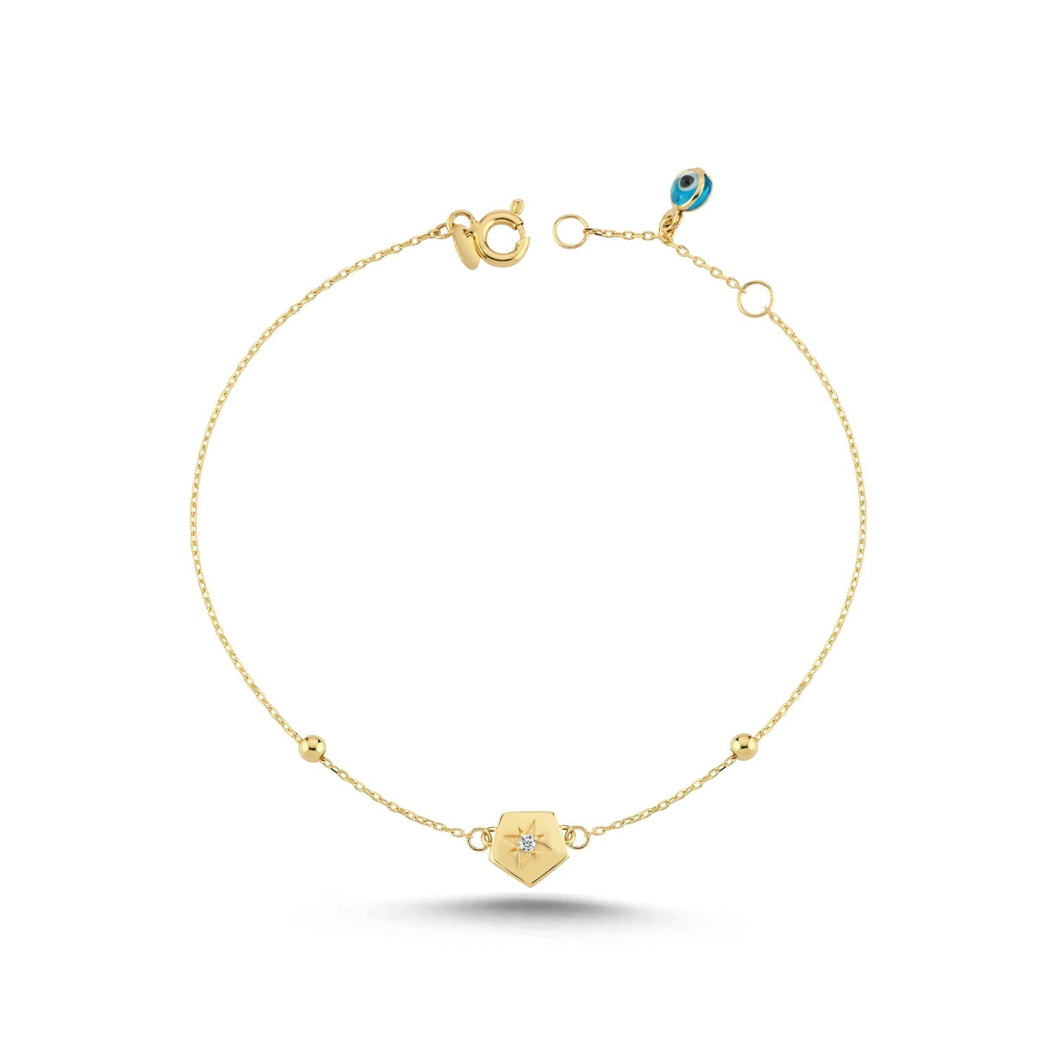 Embrace celestial charm with this 14K Gold Eta Carinae Pentagon Star Bracelet. Featuring a polished pentagon charm with a radiant star, this delicate piece symbolizes guidance and hope. A subtle evil eye charm adds a touch of protection and positive energy.