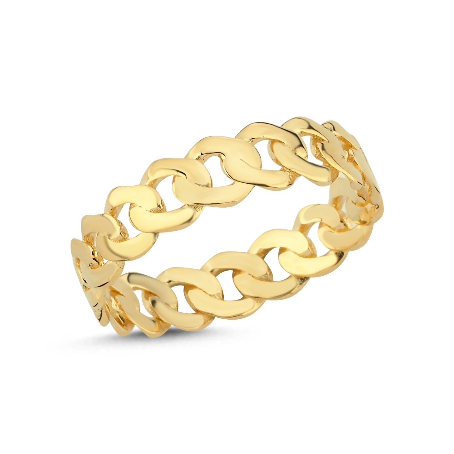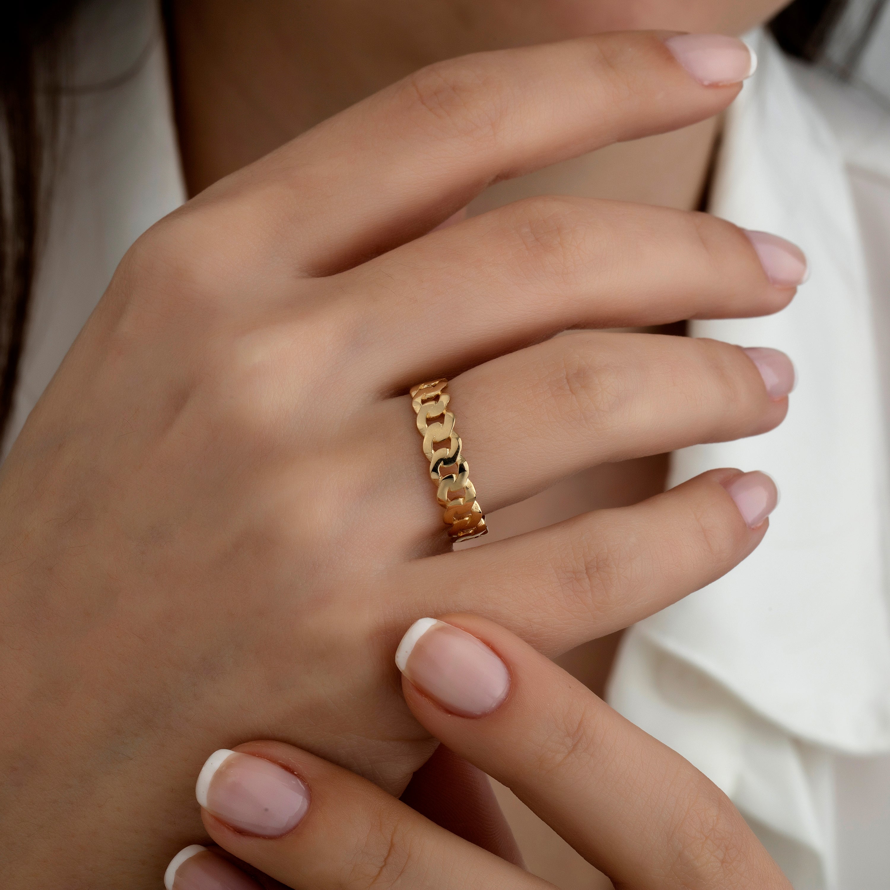 Elevate your everyday look with the sleek strength of this 14K gold Cuban chain ring. Designed with bold interlocking links, this statement piece blends contemporary edge with timeless sophistication, perfect for solo wear or stacking with confidence.