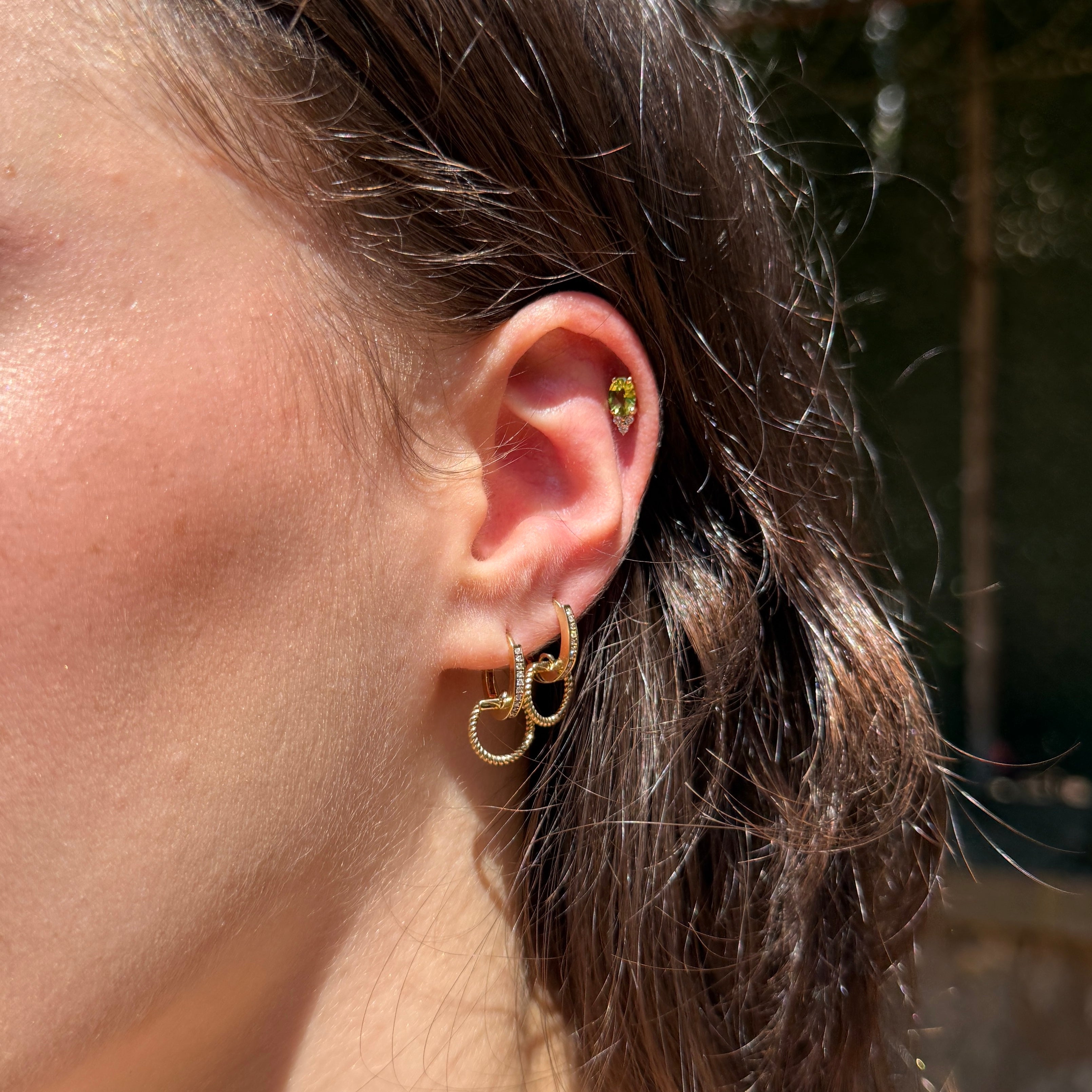 These pavé stirrup earrings offer a sleek yet eye-catching look, perfect for adding modern elegance to any outfit.