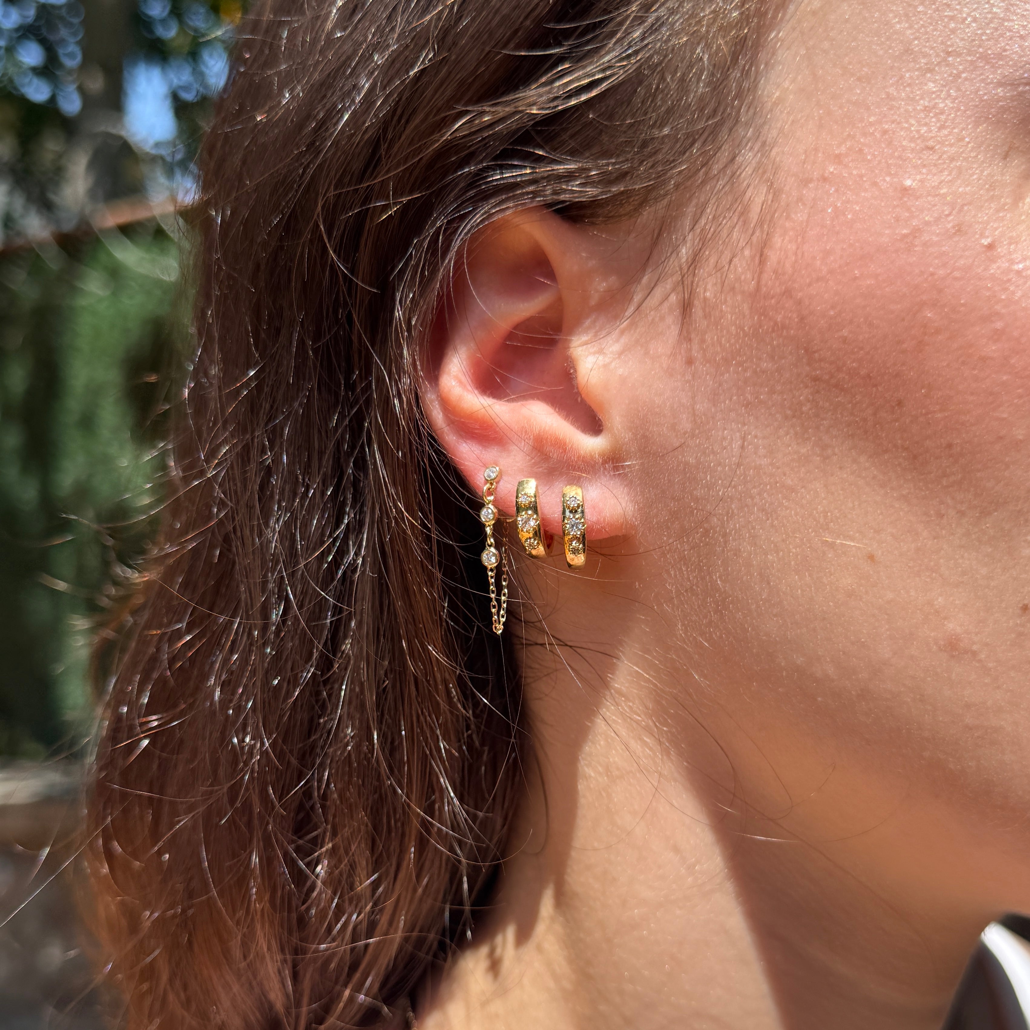 Add timeless elegance to your look with these 14K Gold Three-Stone Diamond Huggie Earrings. Crafted from radiant 14K gold, they feature three brilliant-cut diamonds for a subtle yet striking sparkle. Their sleek huggie design ensures a snug and comfortable fit.