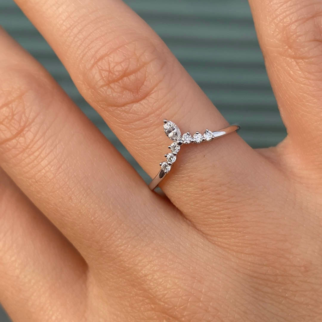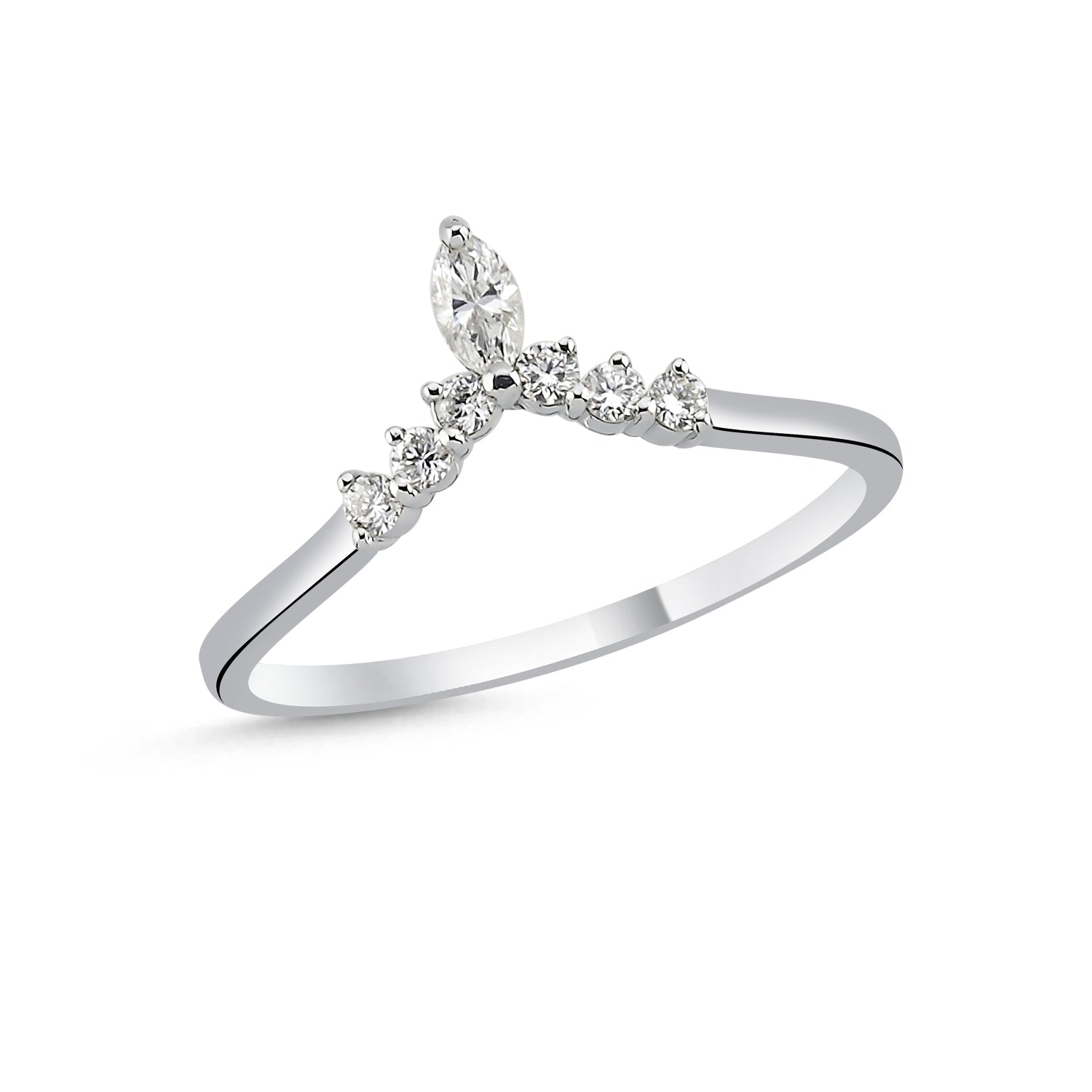Adorn your hand with royal elegance in this 18K white gold marquise diamond crown ring. Featuring a stunning marquise-cut diamond as the focal point, surrounded by a graceful arc of round diamonds, this piece blends timeless sparkle with queenly sophistication.