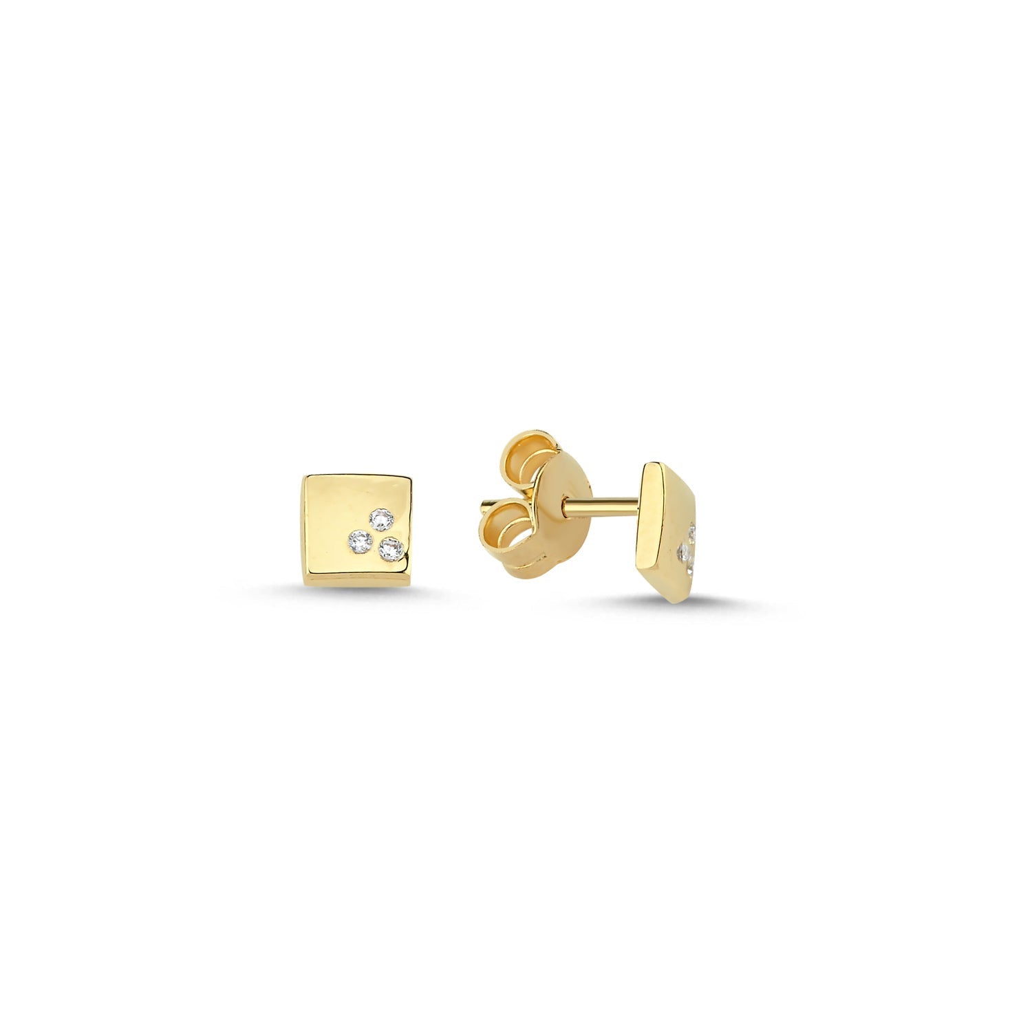 Refined and minimalist, these 14K Gold Square Trio Stone Stud Earrings offer a sleek, modern touch to any look. The square design is accented with three carefully placed stones, adding a subtle sparkle to the polished gold setting.