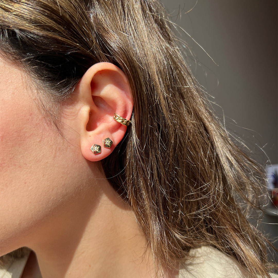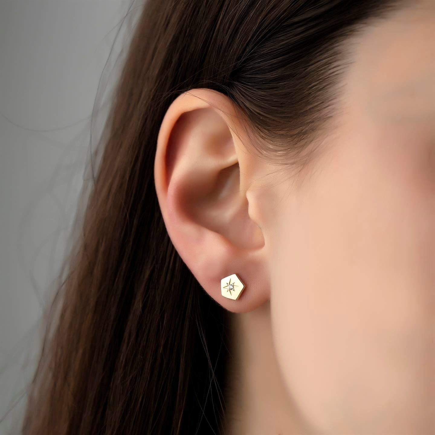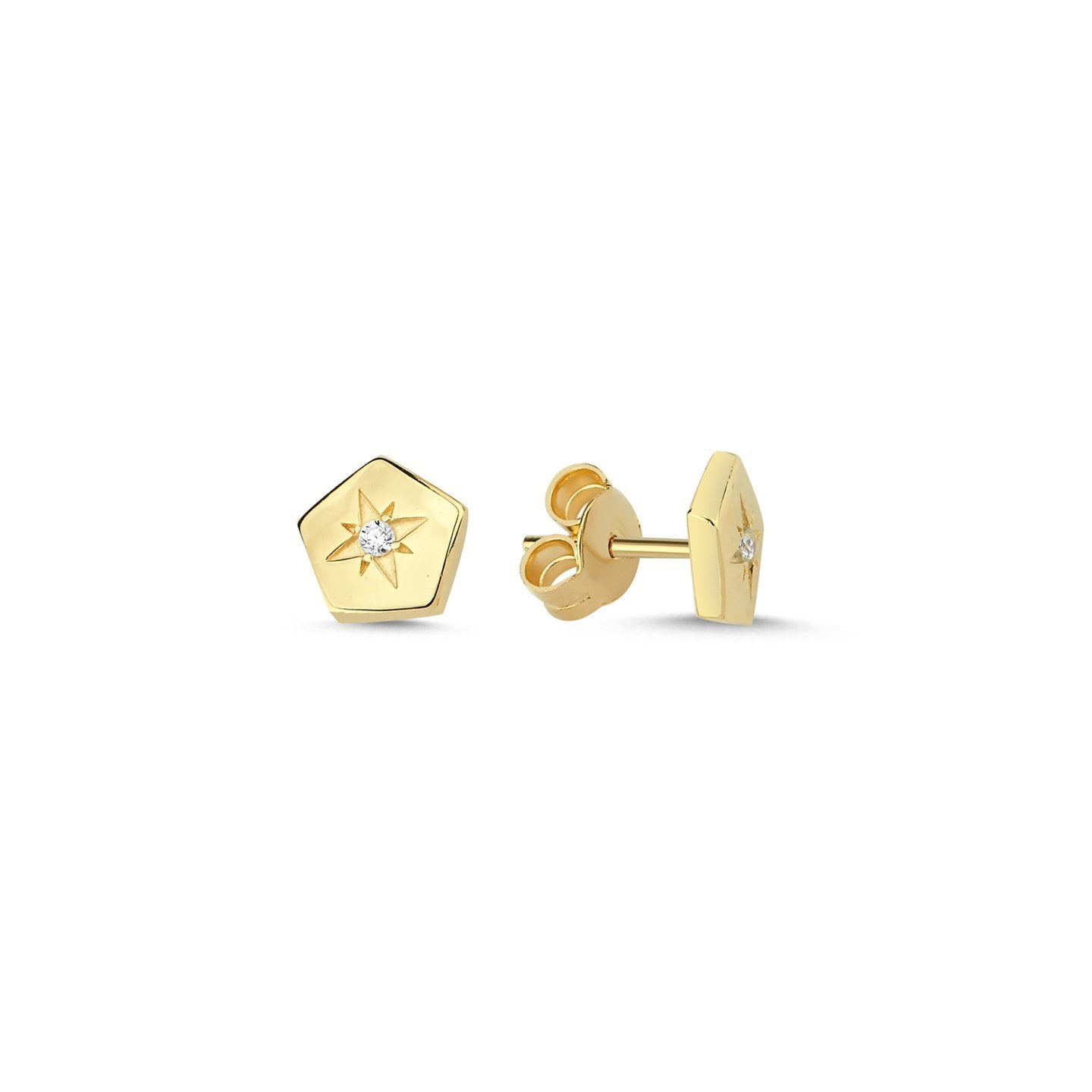 Shine with celestial charm wearing these 14K Gold Eta Carinae Penta Star Stud Earrings. Crafted from radiant 14K gold, these delicate studs feature a polished pentagon design with a sparkling star motif at the center.