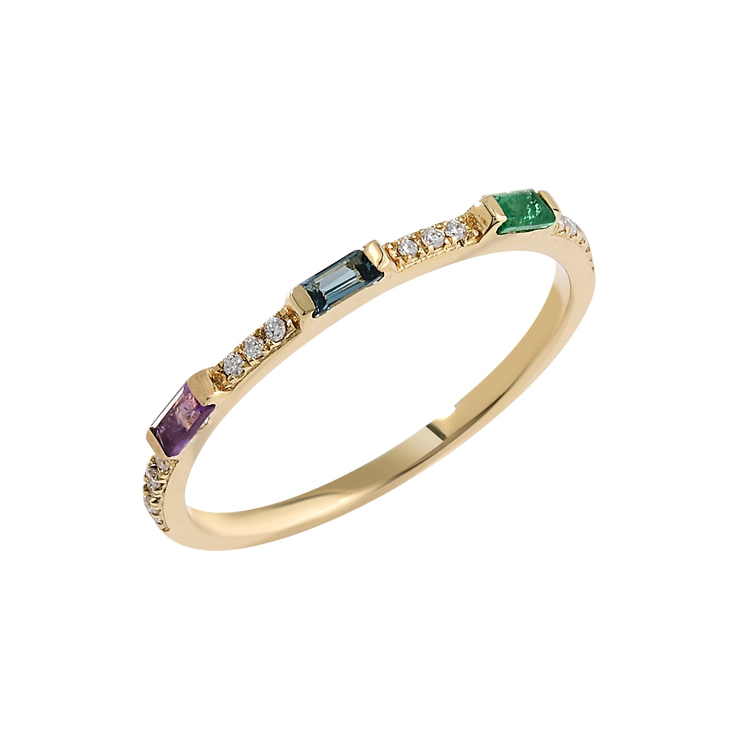 Celebrate color and sparkle with this 14K gold diamond mixed sapphire ring. Featuring a curated mix of baguette-cut sapphires in vibrant hues and shimmering diamonds, this ring is a joyful expression of modern elegance.