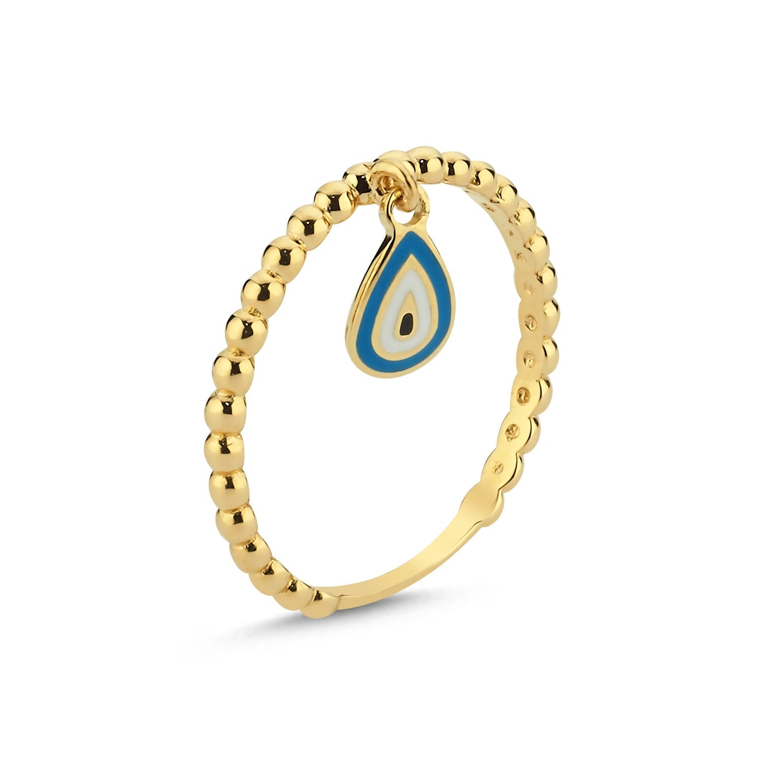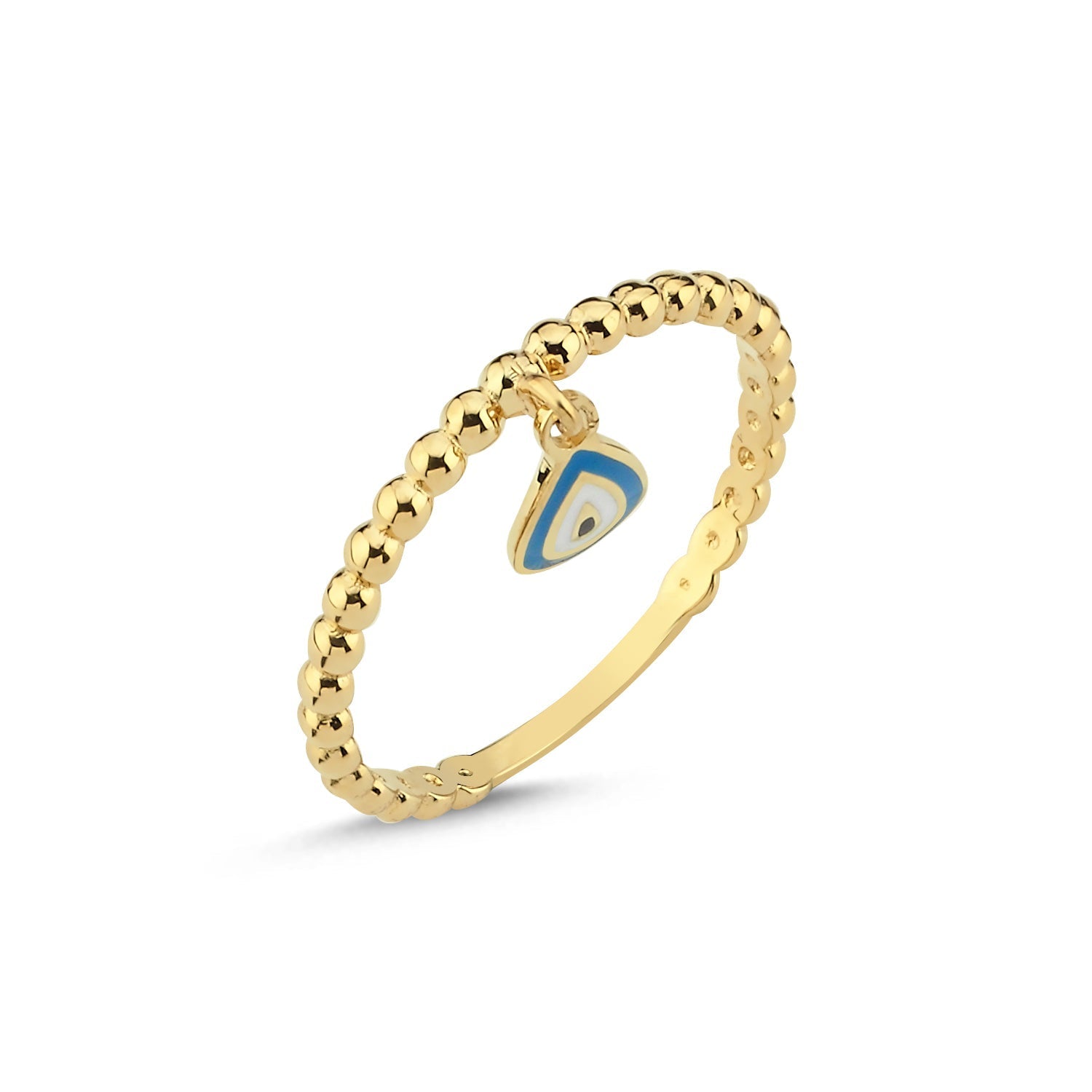 14K Gold Beaded Evil Eye Charm Stackable Ring