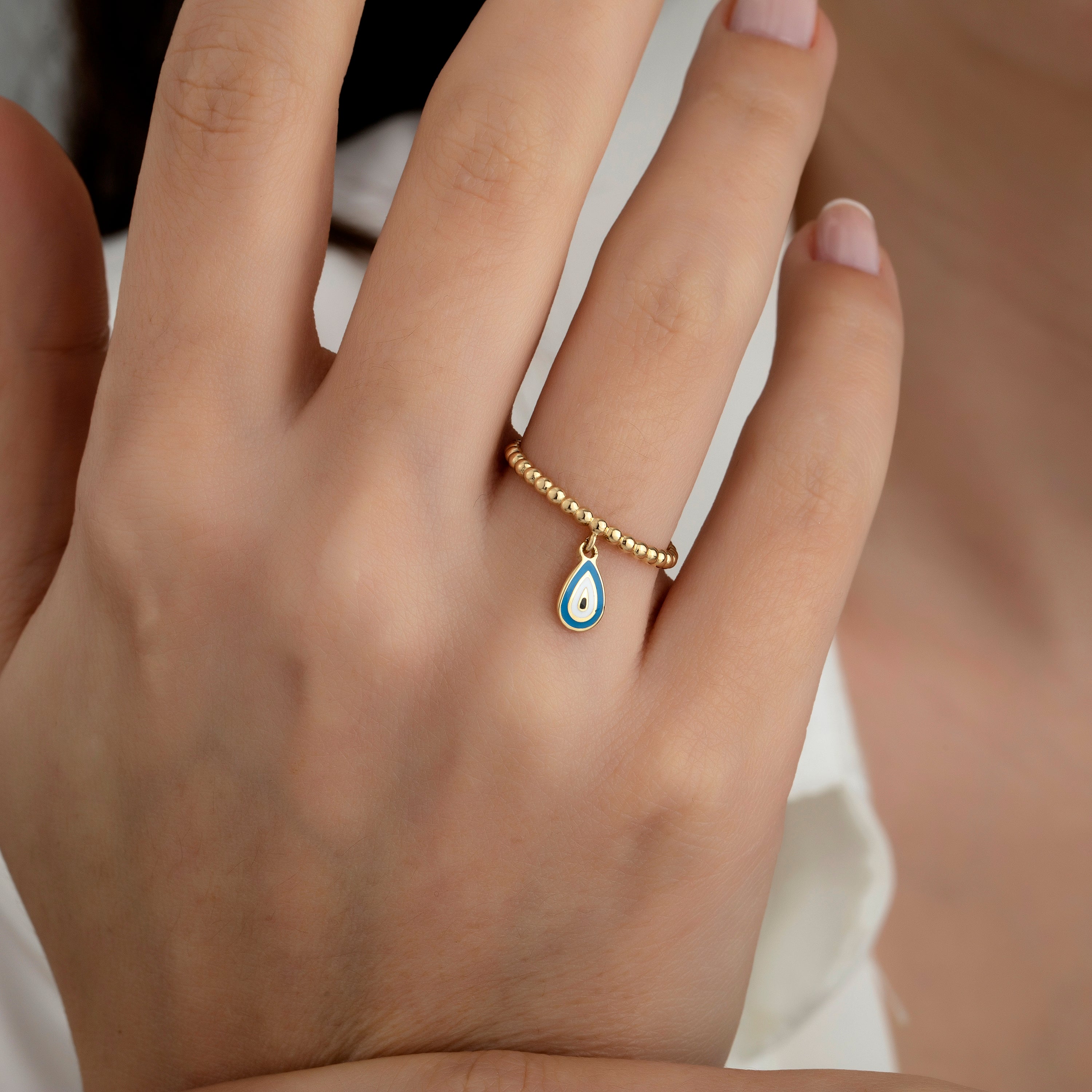 Add a pop of charm and meaning to your jewelry collection with this 14K gold beaded evil eye ring. Featuring a dainty enamel evil eye charm that dangles from a polished bead-style band, this piece blends protection with playful elegance.