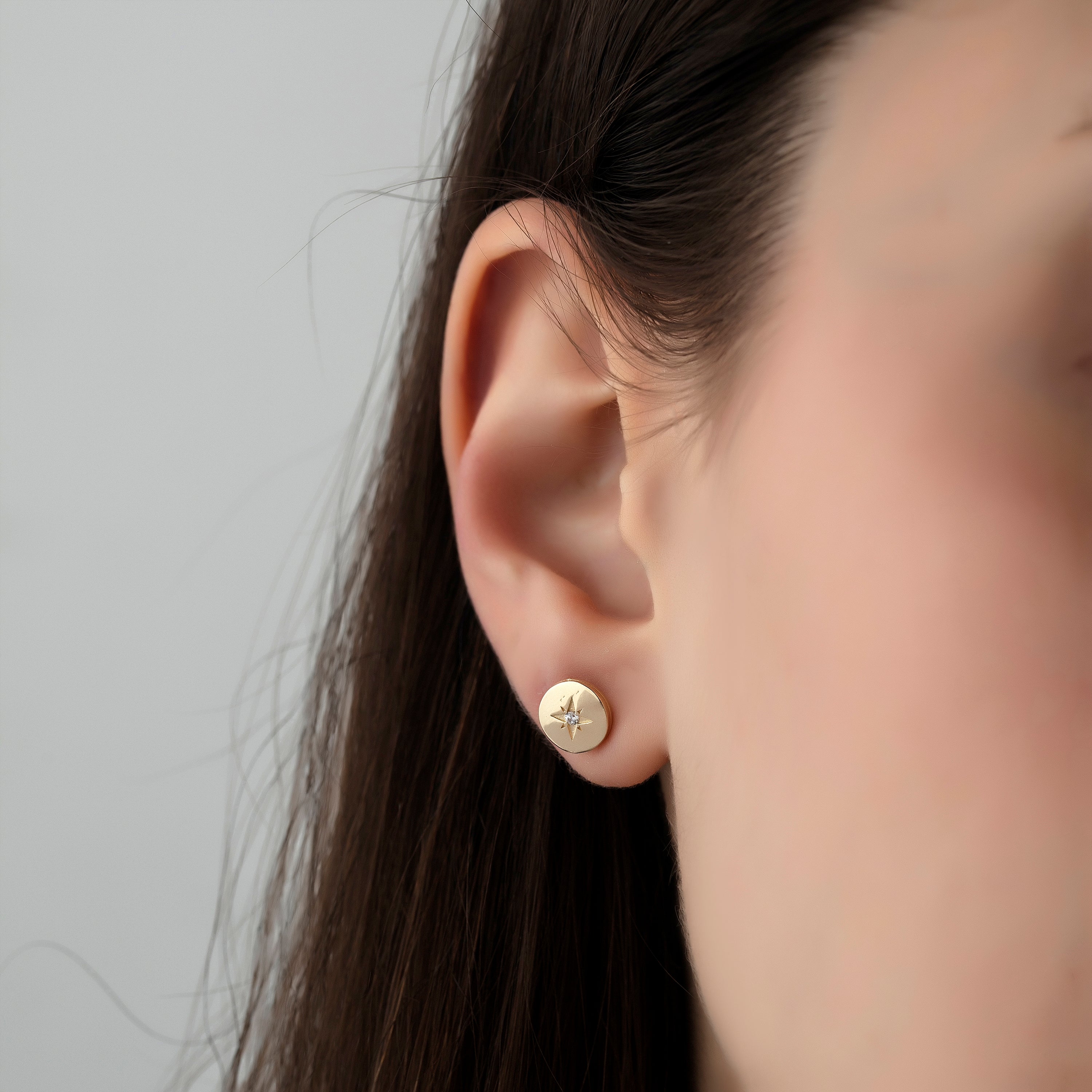 Shine with celestial elegance in these 14K Gold Dainty Eta Carinae Star Stud Earrings. Featuring a delicate starburst design accented with a sparkling stone at the center, these earrings capture the beauty of the night sky.