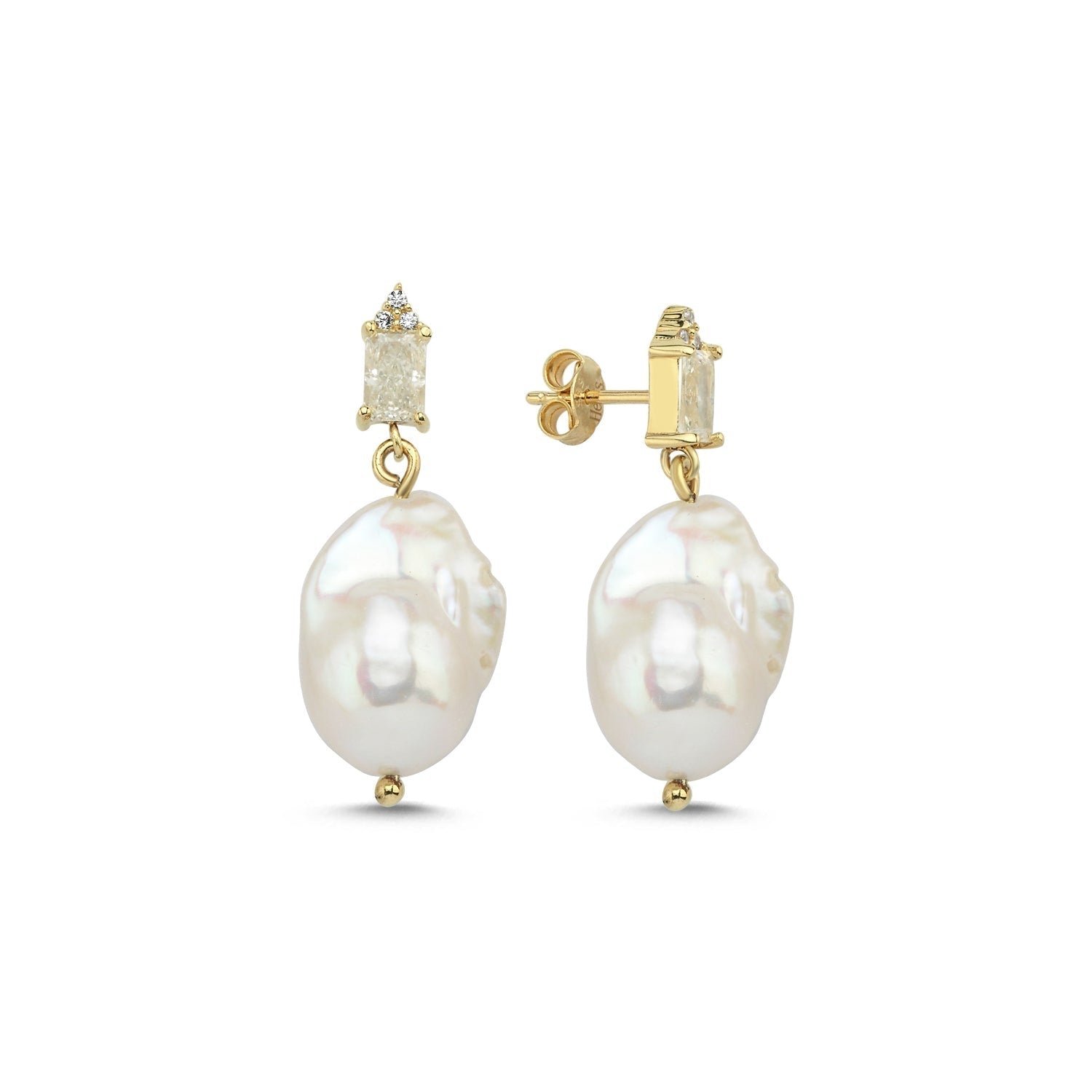 14K Gold Pear-Cut Baguette Baroque Pearl Dangle Earrings (L)