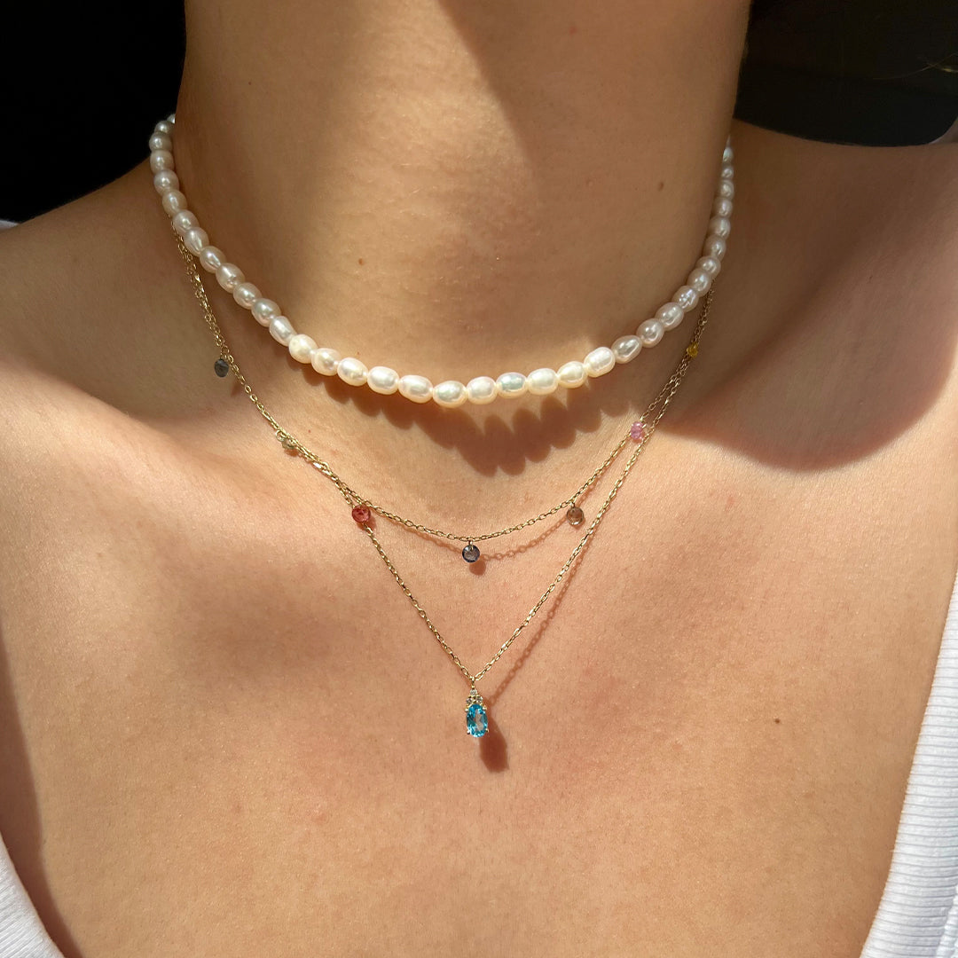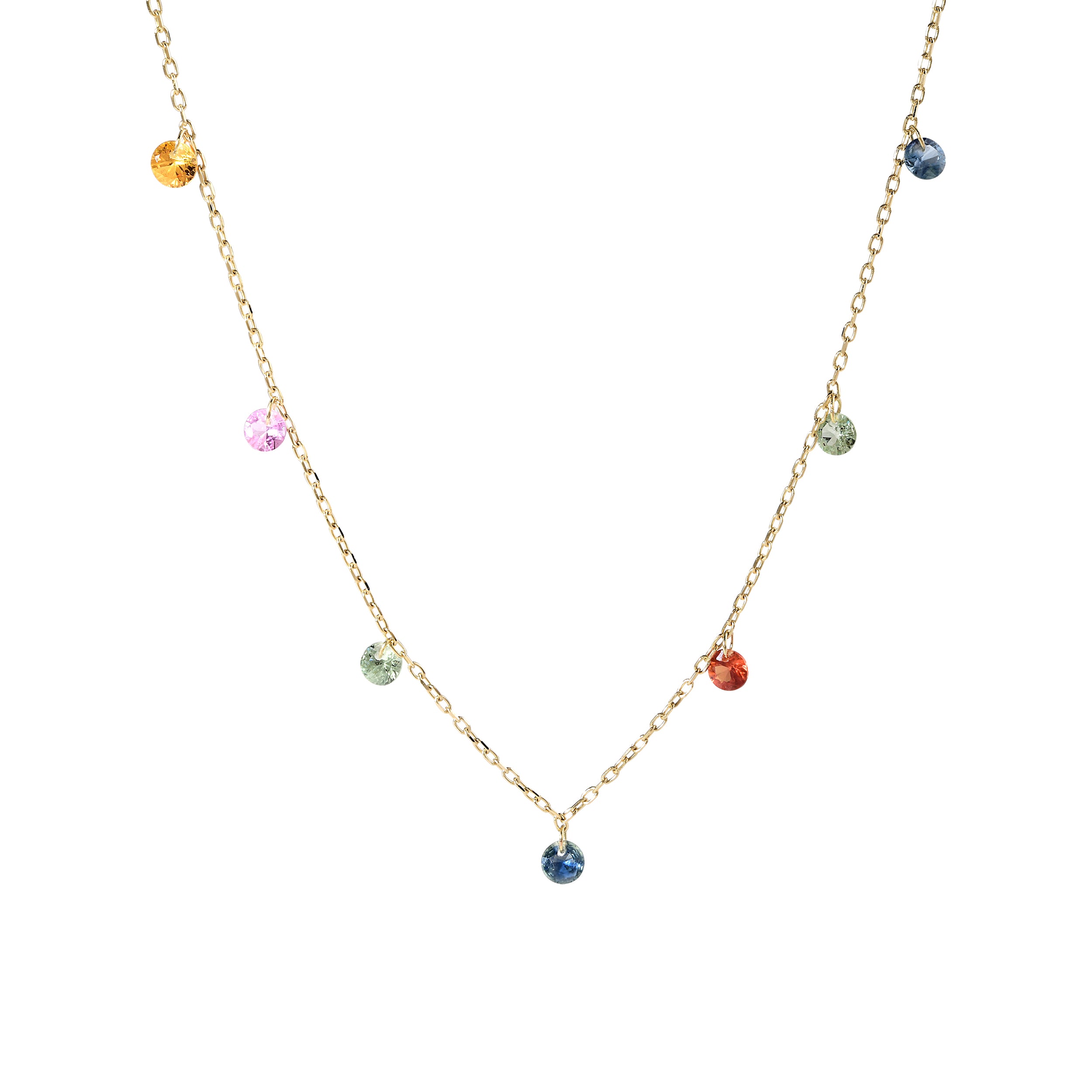 Let your beauty shine with this enchanting 14K gold sapphire necklace, a delicate symphony of color and elegance. Each shimmering sapphire dances along the fine gold chain, capturing the magic of light and movement with every step you take.