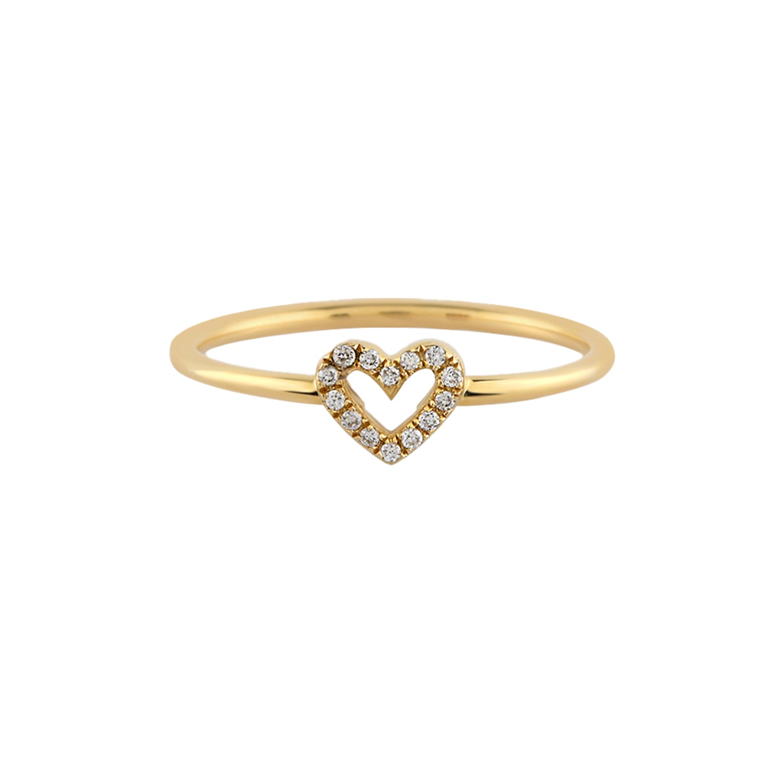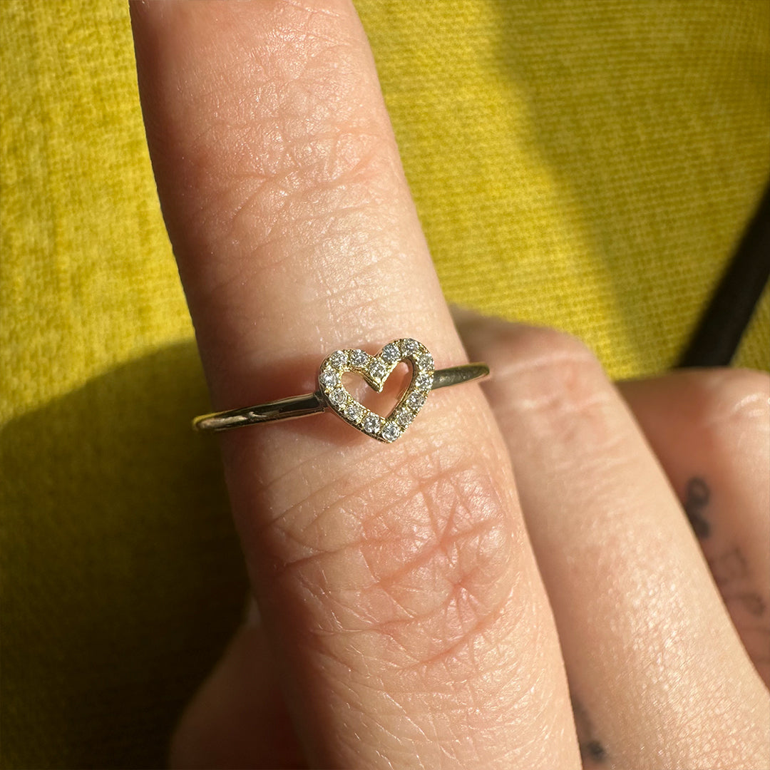 Celebrate love with this 14K gold diamond dainty heart ring. Featuring a delicate open heart shape encrusted with pavé-set diamonds, this piece captures timeless romance in a minimalist, stackable design.