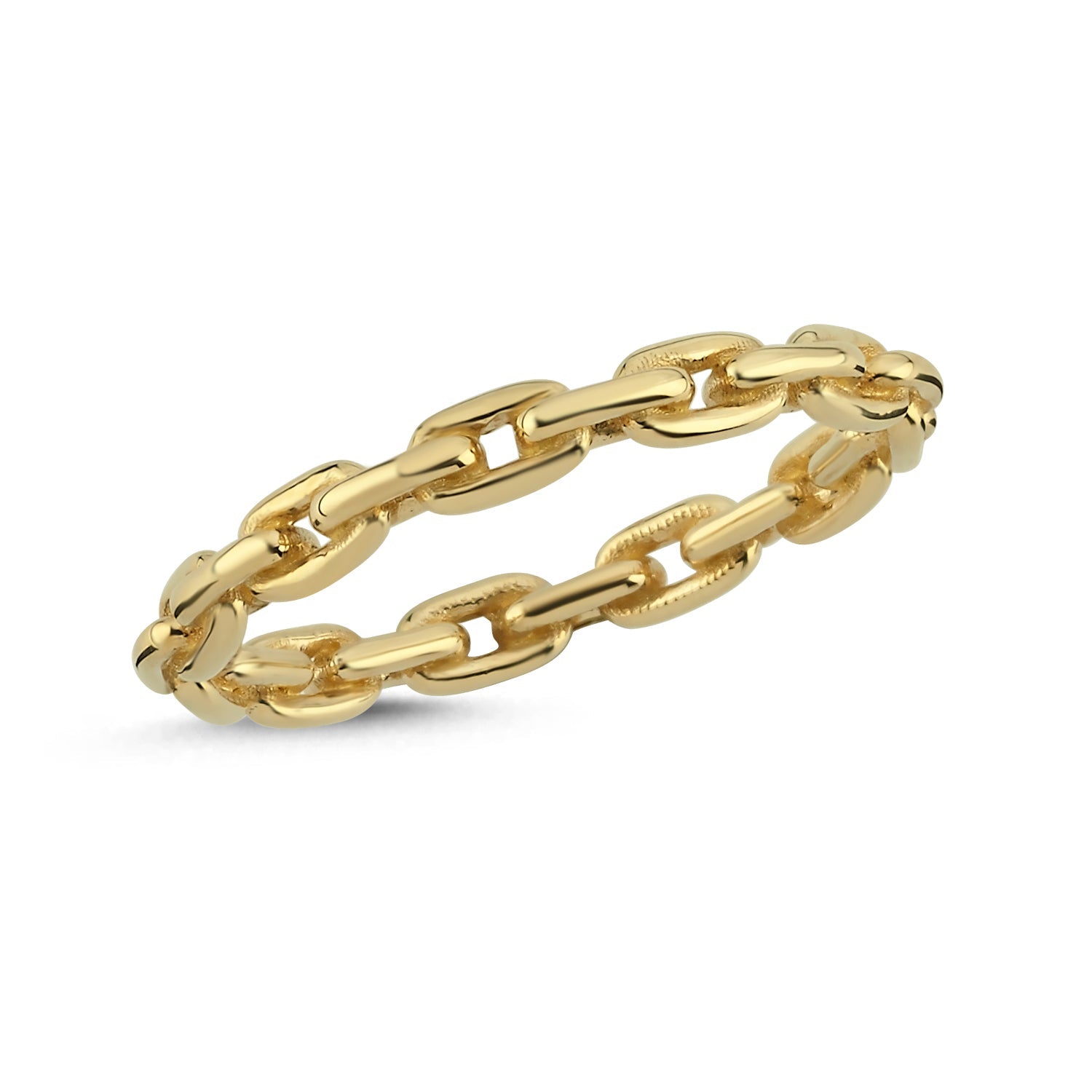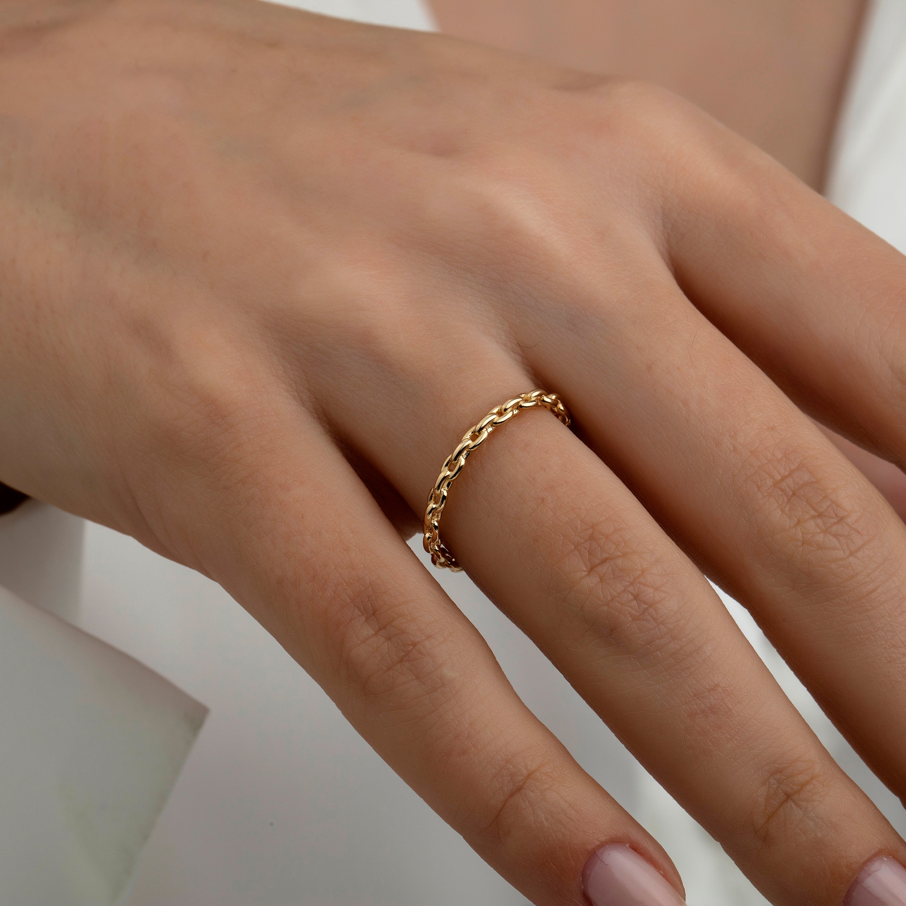 Bold yet refined, this 14K gold chain stackable ring brings a fresh edge to your everyday jewelry collection. Crafted with interlocking polished links, it offers the perfect balance of structure and sophistication.