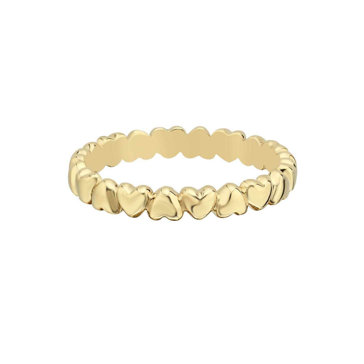 Romantic and radiant, this 14K gold eternity ring features a continuous band of polished hearts. Its timeless design symbolizes everlasting love, making it perfect for stacking, gifting, or celebrating meaningful milestones.