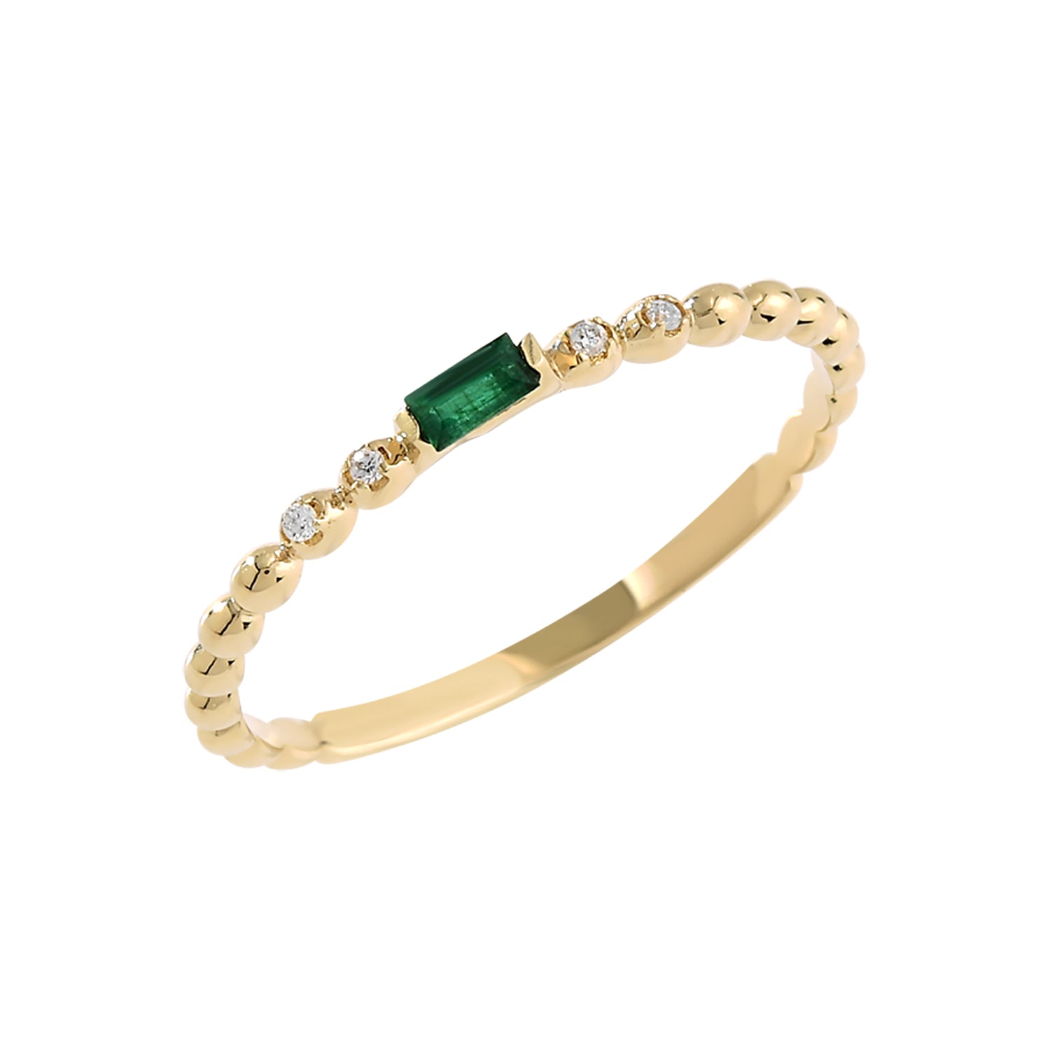 Bring color and charm to your stack with this 14K gold dainty baguette emerald diamond ring. Featuring a beaded band, a vibrant baguette-cut emerald, and round diamond accents, this ring combines texture, brilliance, and elegance in a fresh, modern silhouette.