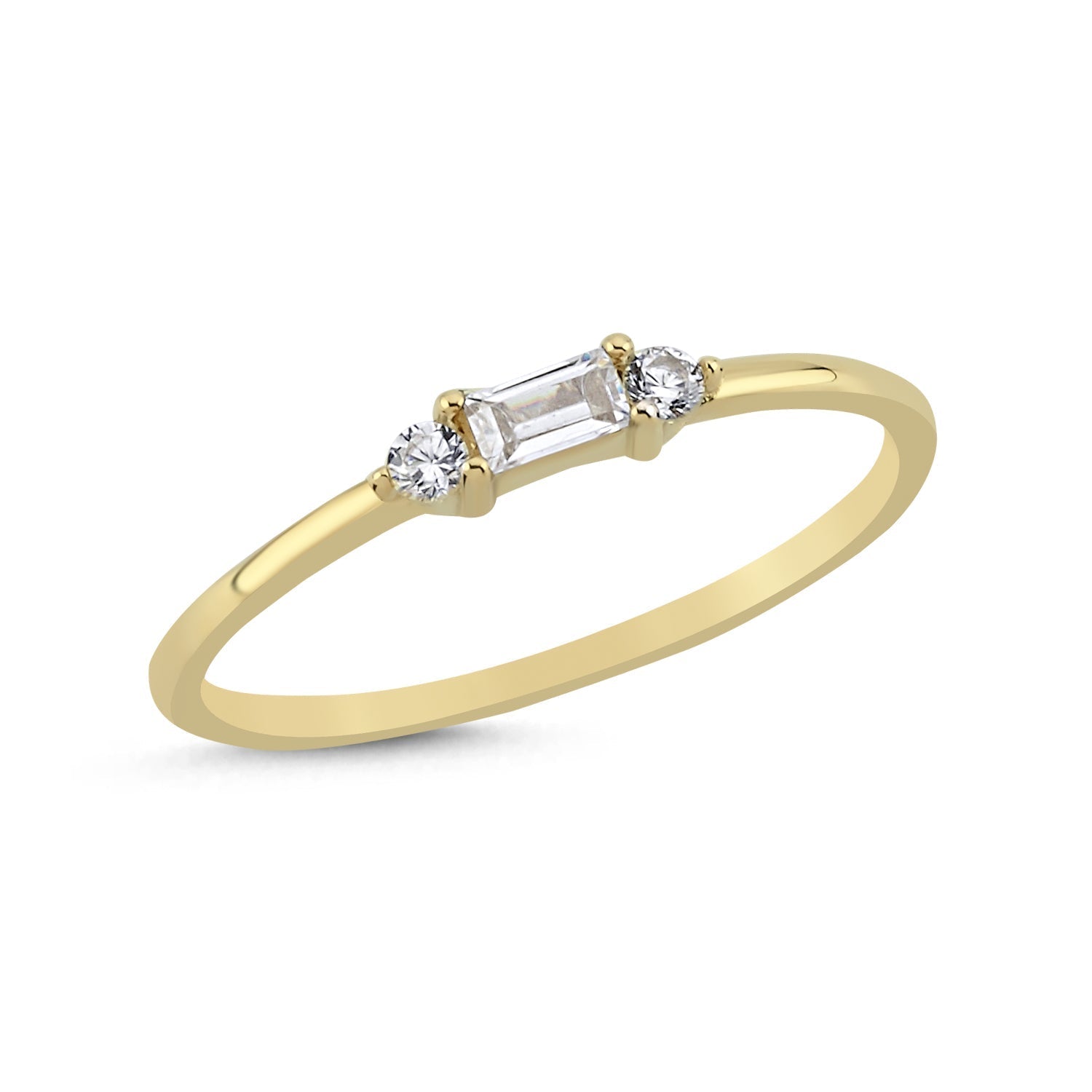 Sleek and radiant, this 14K gold baguette stone ring brings refined elegance to your stack. The central baguette-cut stone is gracefully framed by two round accents, creating a timeless silhouette with a modern edge.