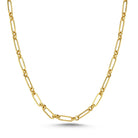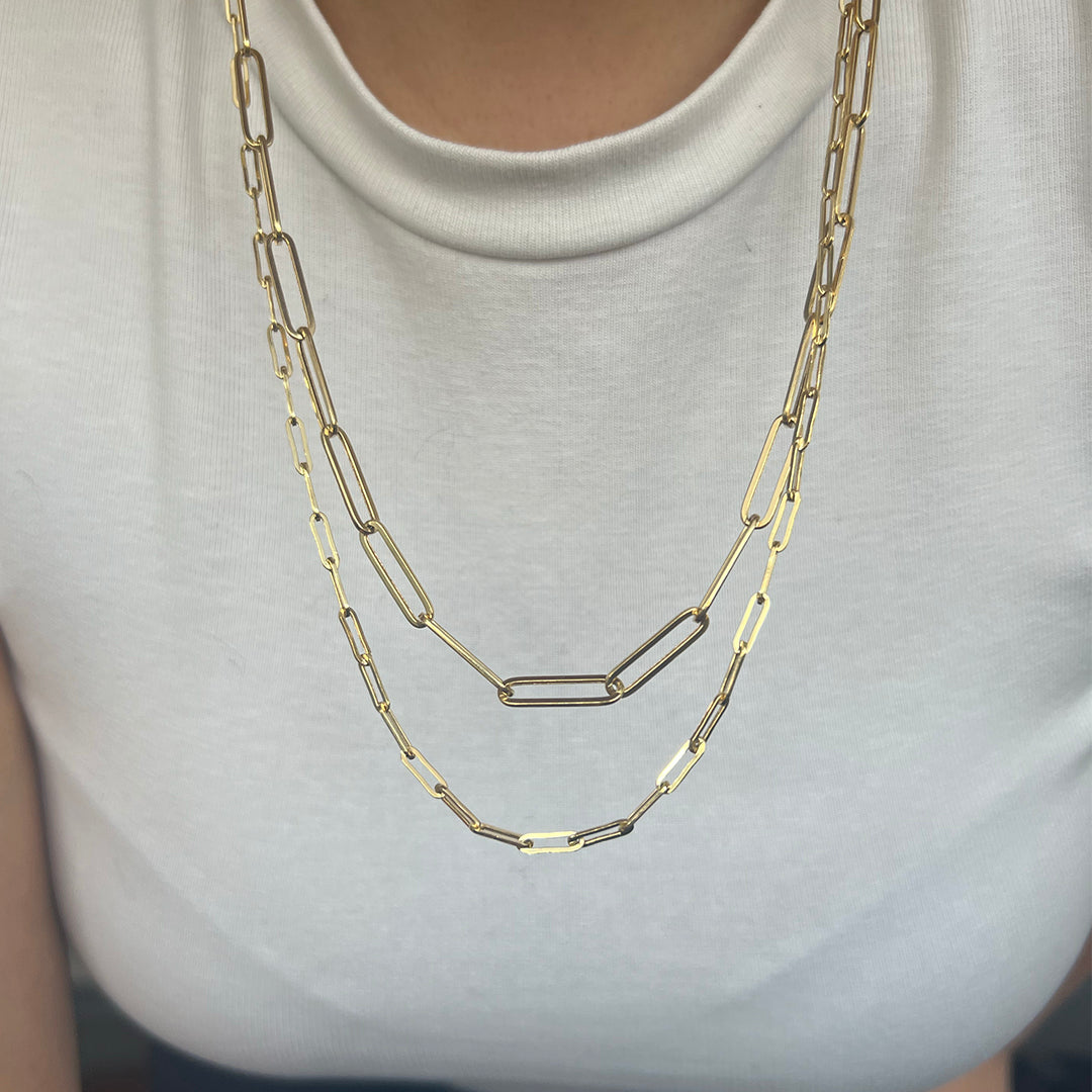 - Modern paperclip-style chain with elongated, polished links