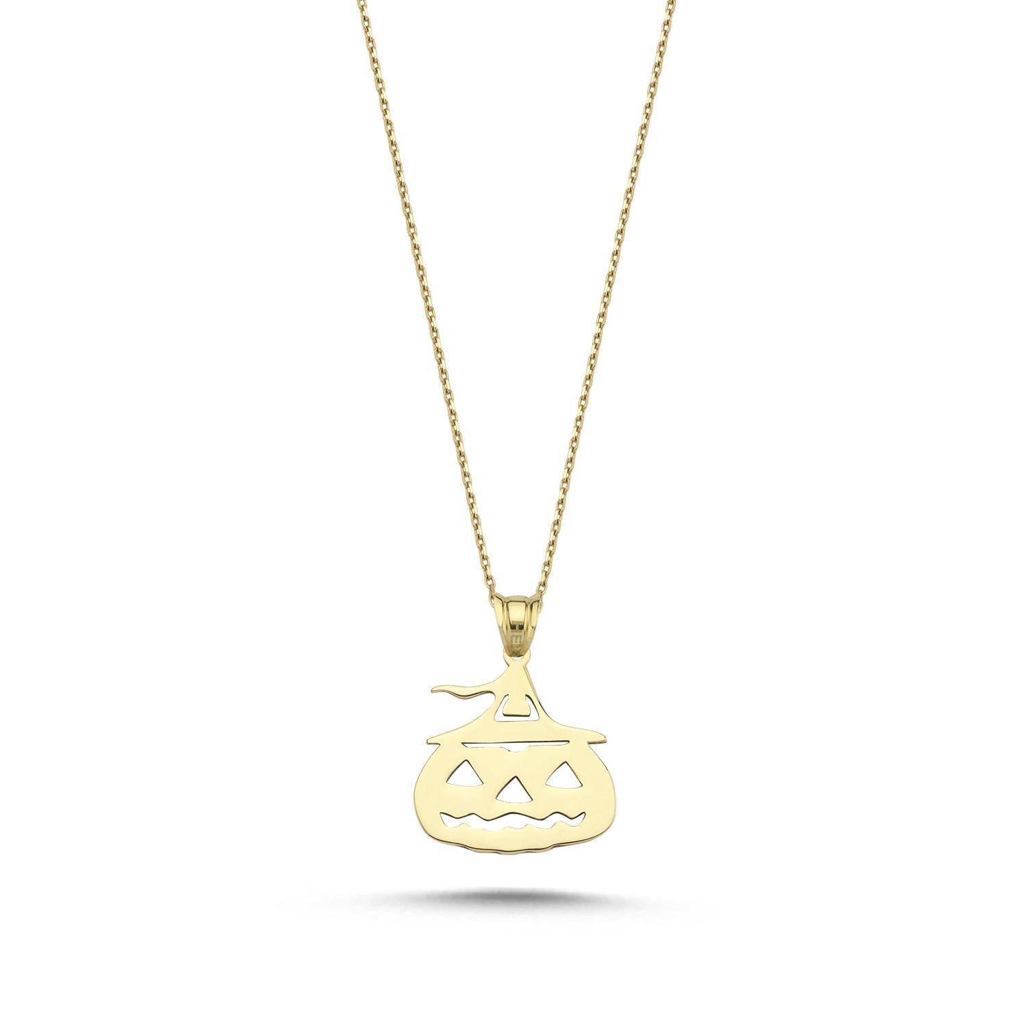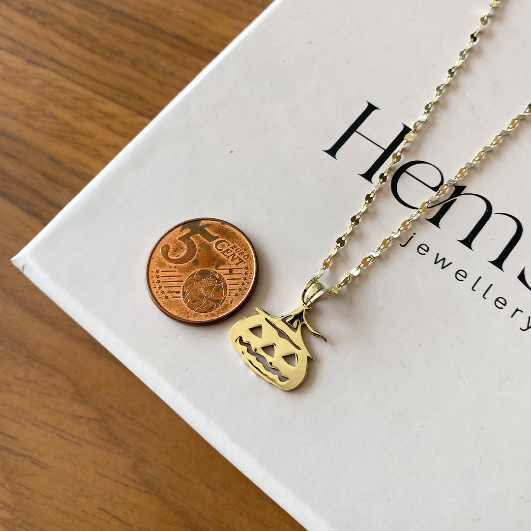 - Jack-O’-Lantern cutout pendant with a sleek, polished gold finish