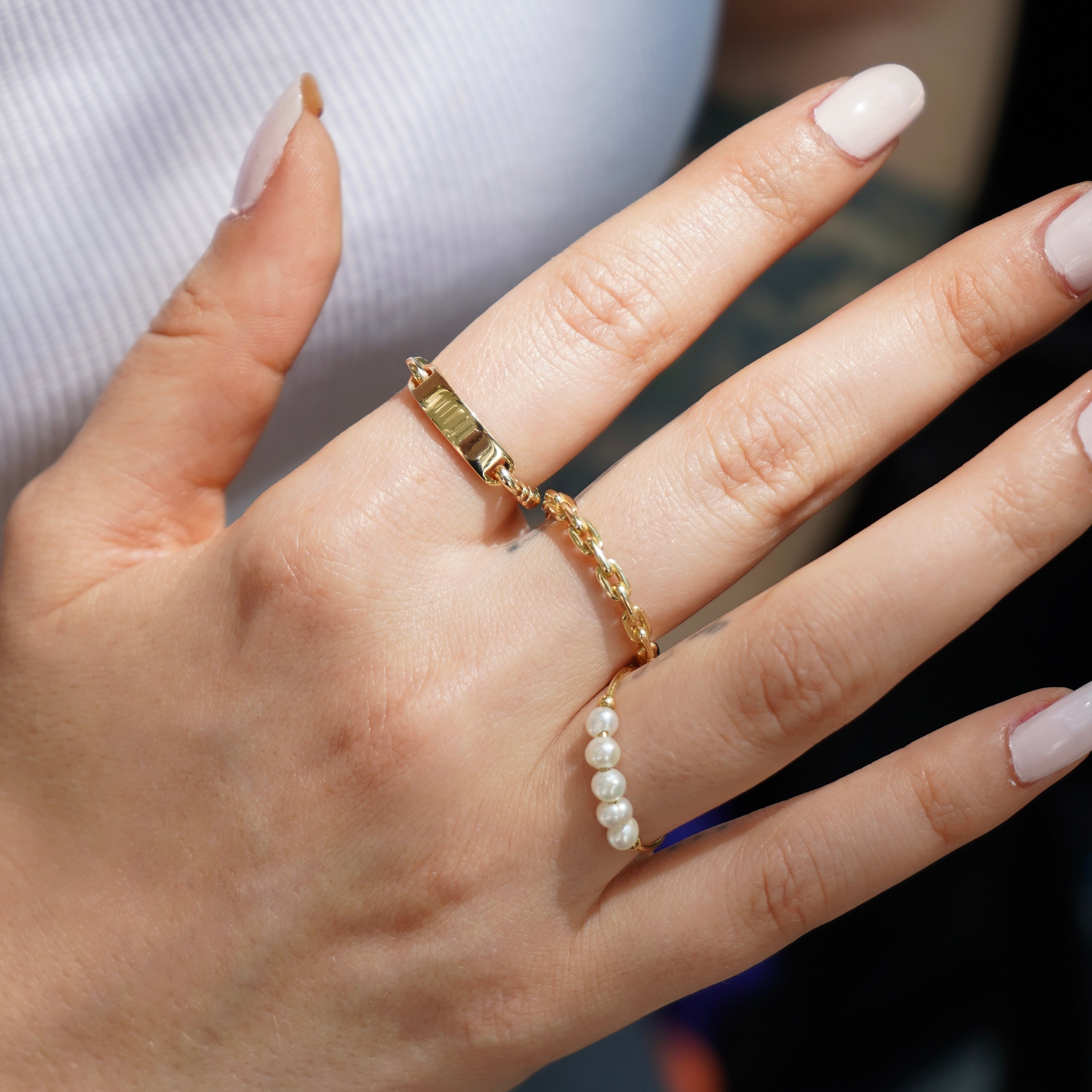 The combination of warm gold and soft pearls makes this ring a timeless yet modern statement. Perfect for everyday wear or layering with other pieces.