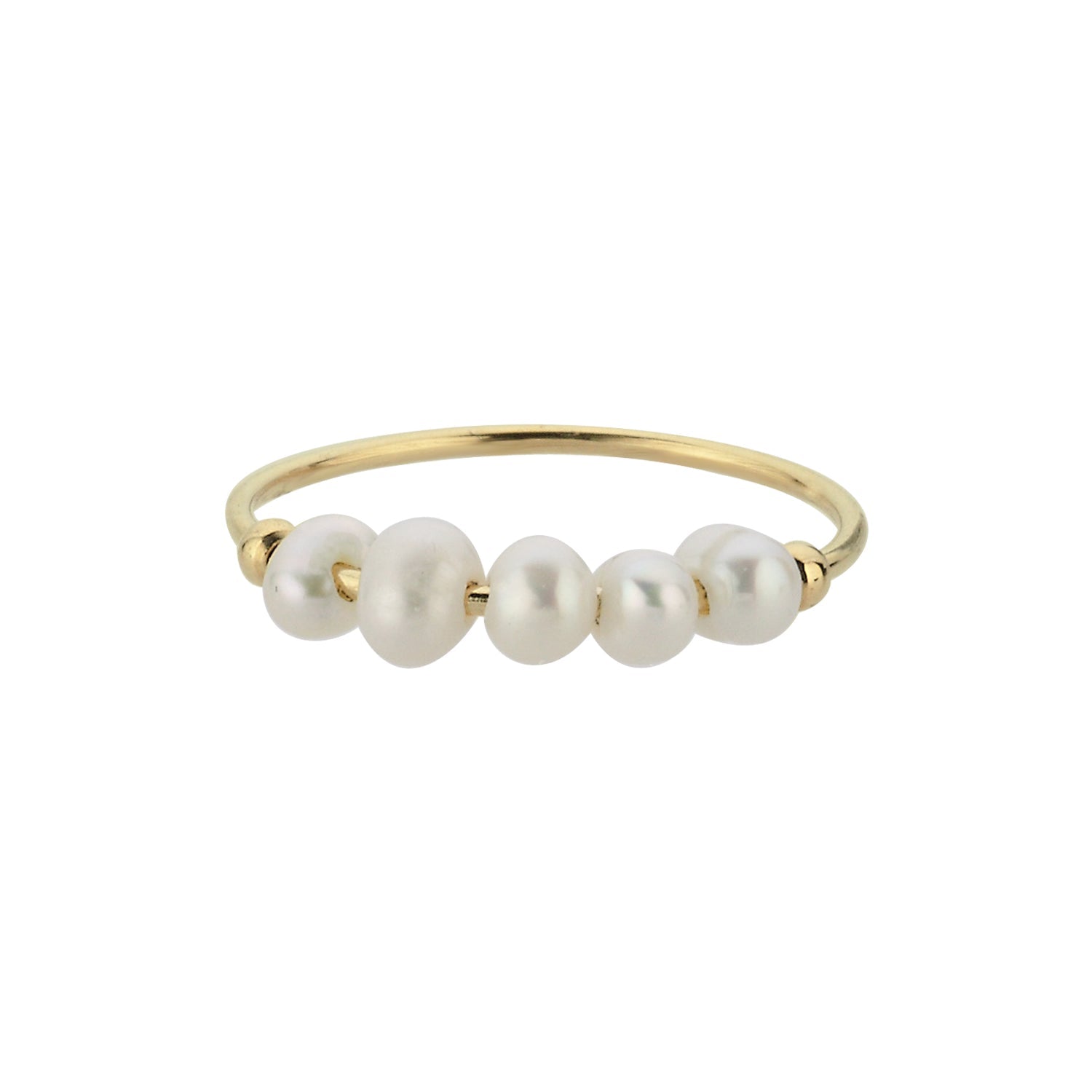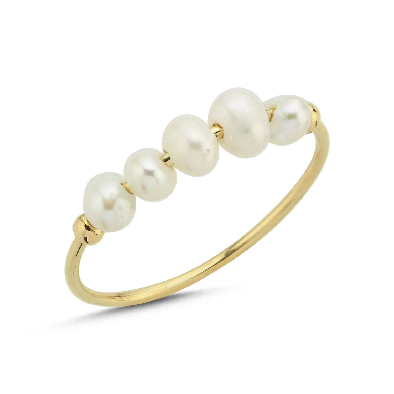 Add a soft, elegant touch with this 14K gold pearl row ring, designed for effortless sophistication. The smooth gold band is adorned with five lustrous one-of-a kind freshwater pearls, creating a balanced and refined look.