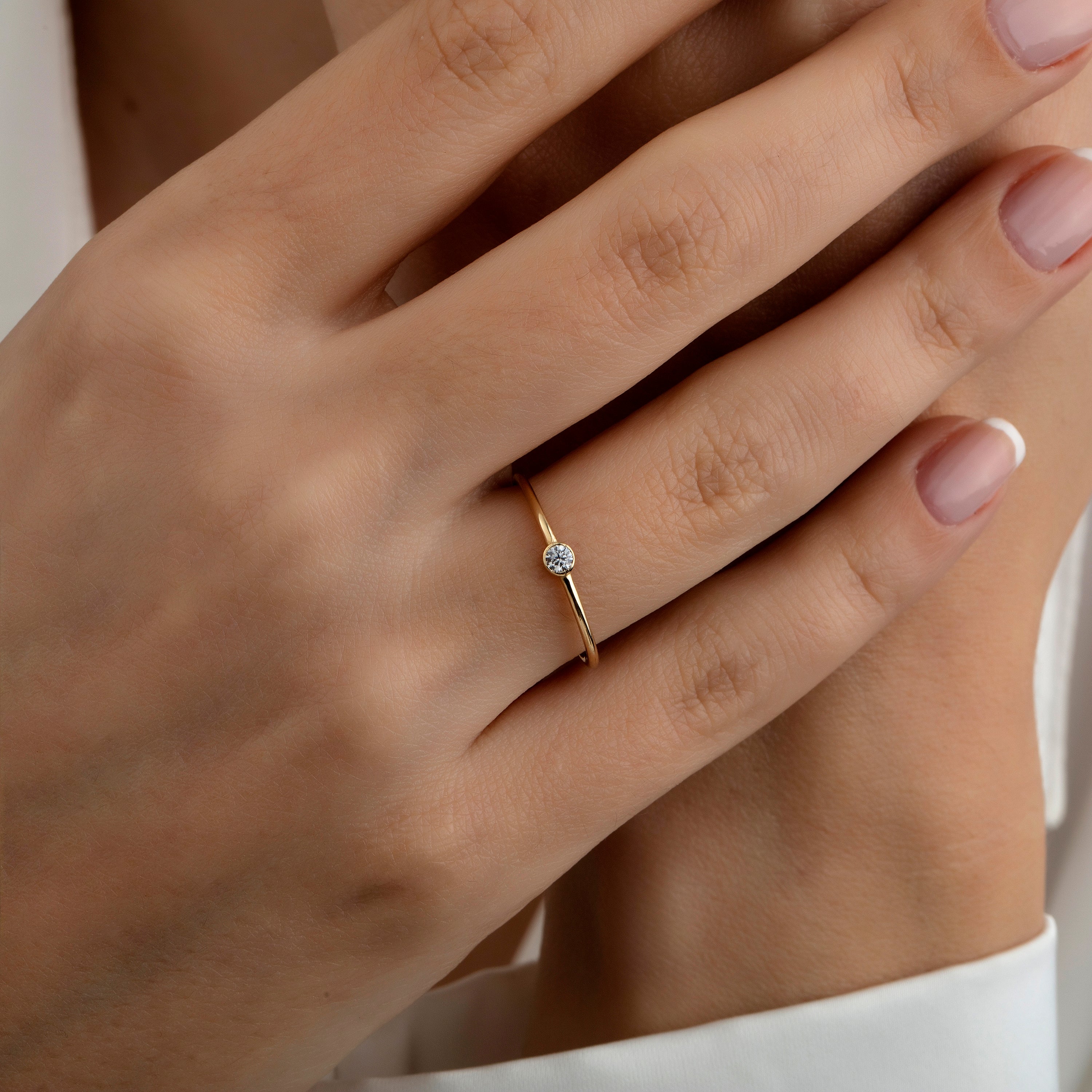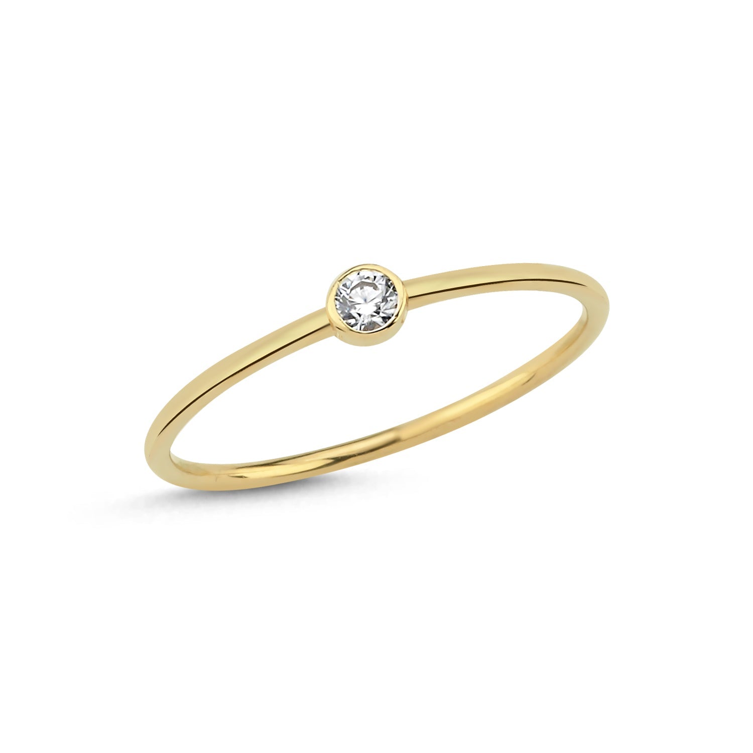 Refined and effortlessly elegant, this 14K gold bezel-set ring is a timeless addition to your jewelry lineup. Featuring a single round-cut stone in a sleek bezel setting, this dainty band brings a clean, modern glow to your everyday stack.