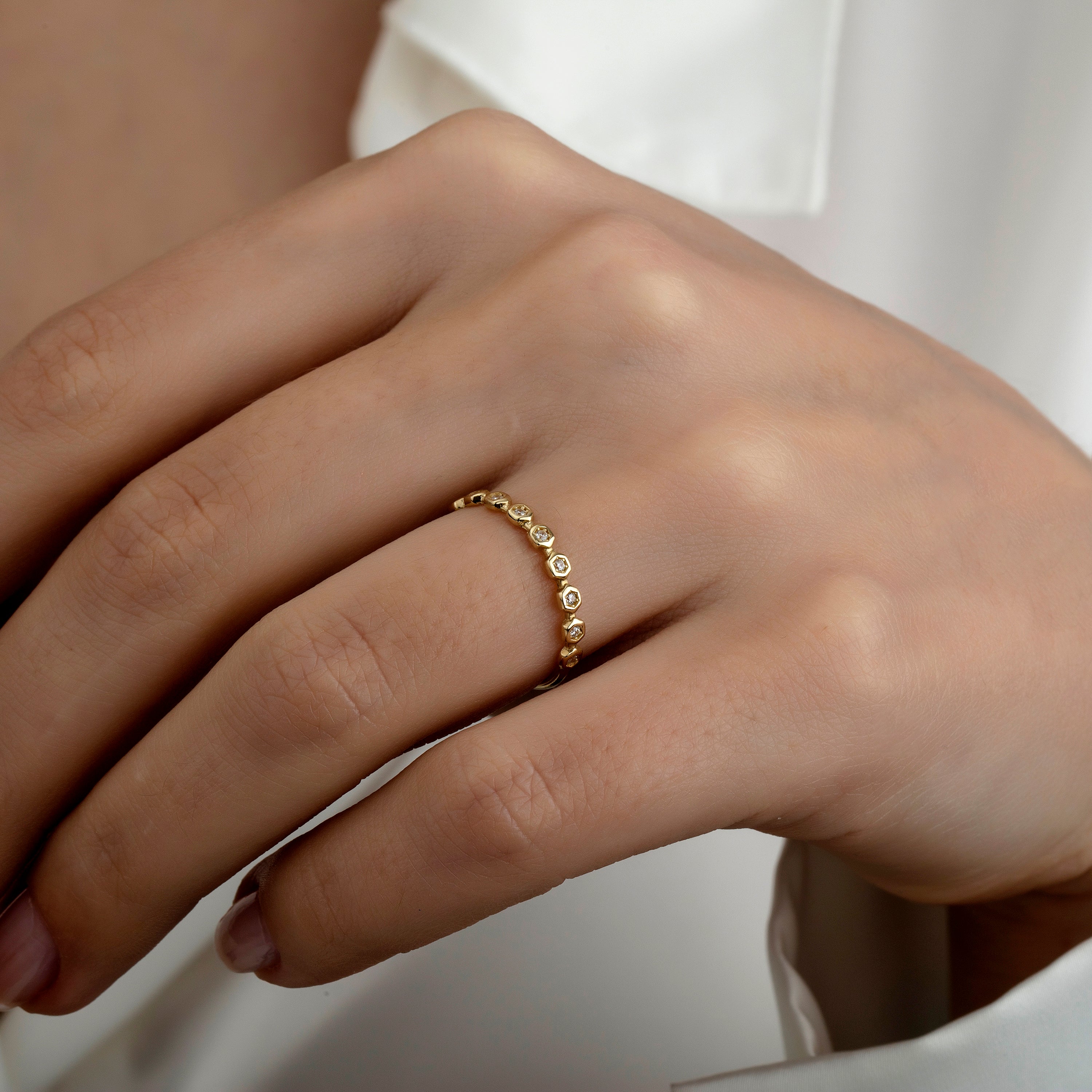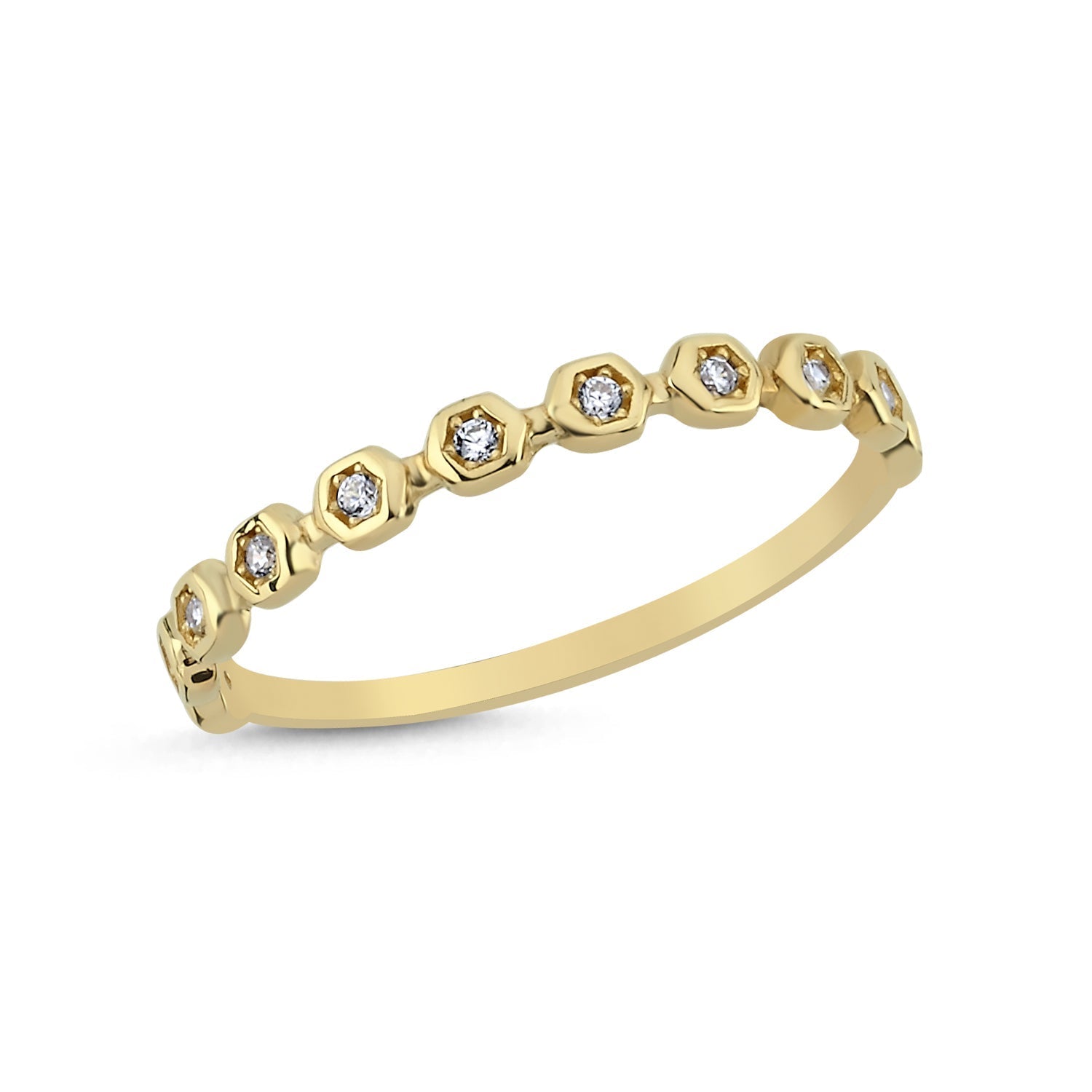 Complete your stack with this 14K gold dainty ring, designed with a series of hexagon-shaped settings and sparkling stones. Lightweight and eye-catching, this ring adds a modern architectural feel to any jewelry combination, a standout on its own or as part of a layered look.