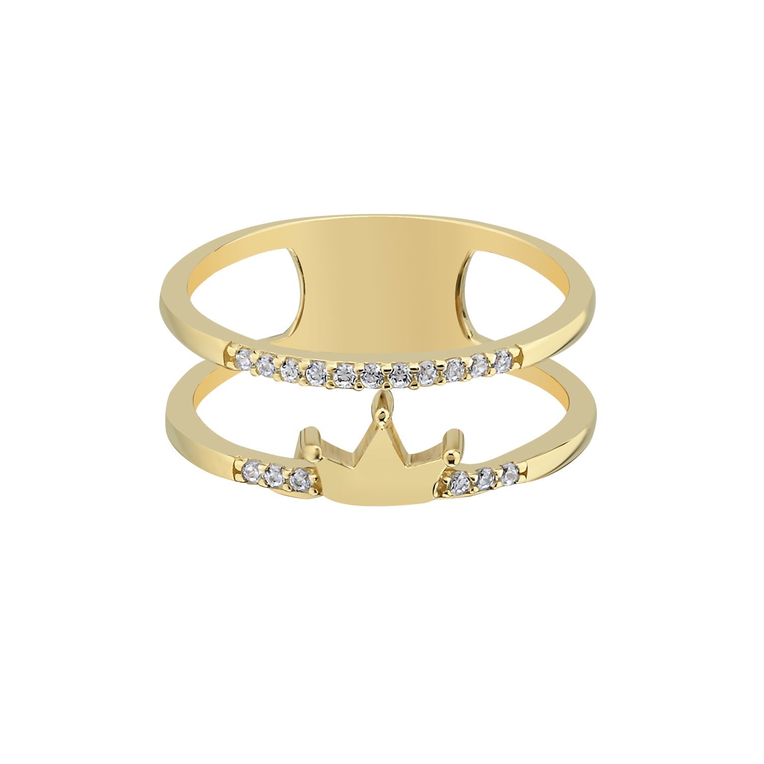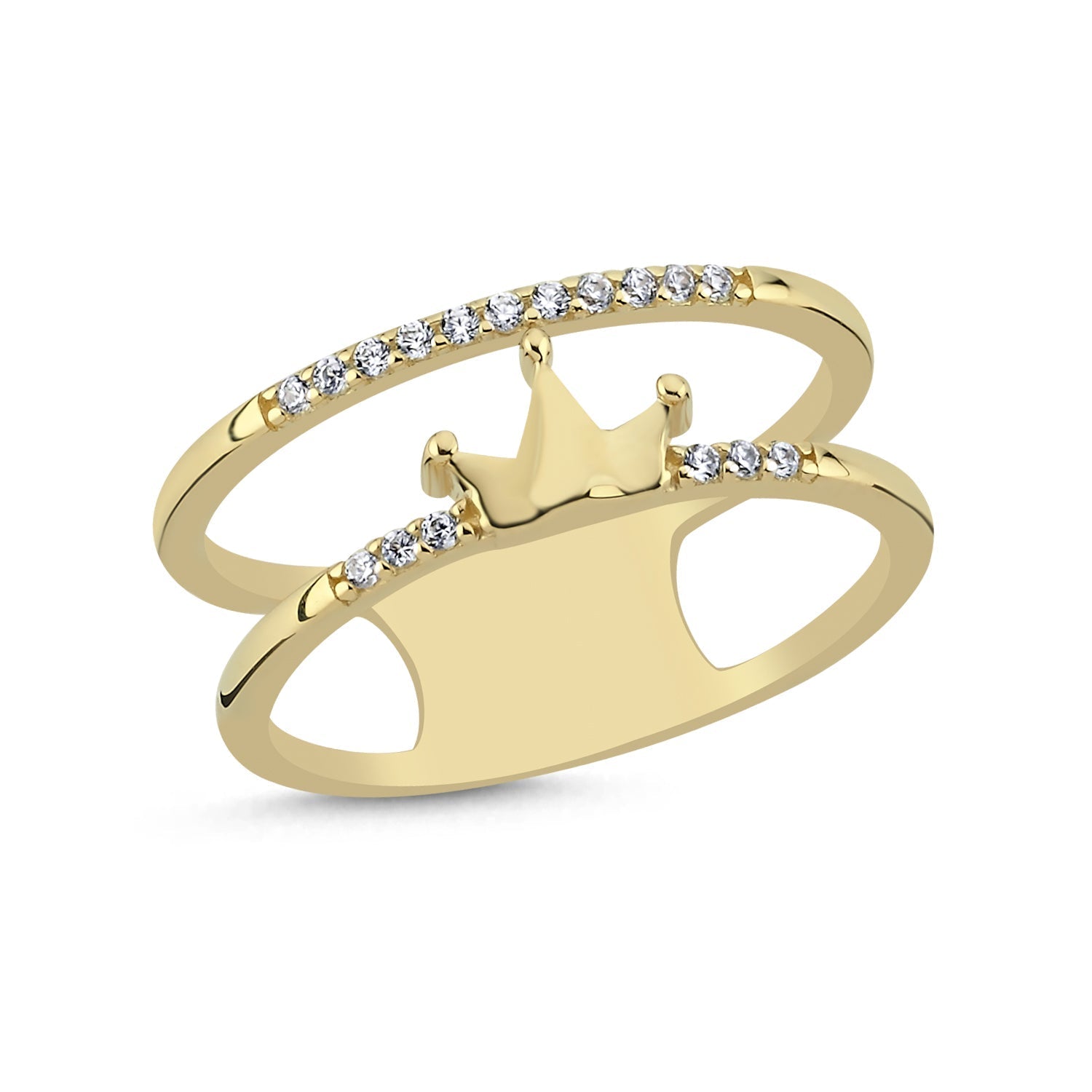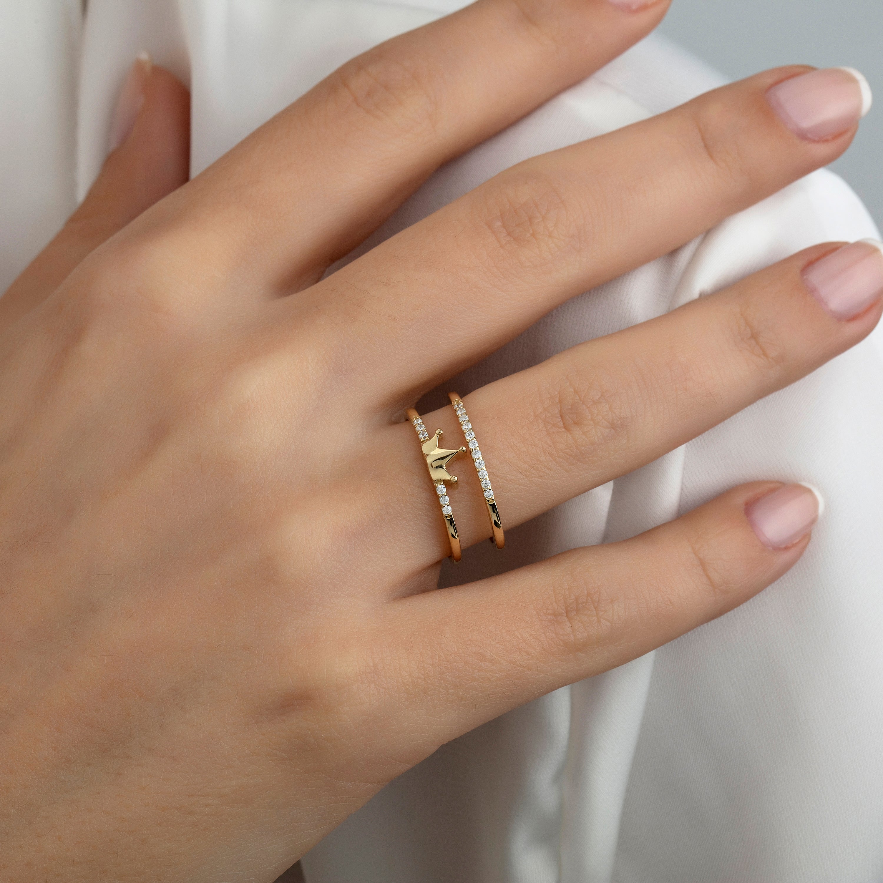 Make a royal statement with this 14K gold crown-inspired double band ring. Featuring two delicately curved bands accented with shimmering stones and a playful crown motif at the center, this design brings a modern twist to regal elegance.