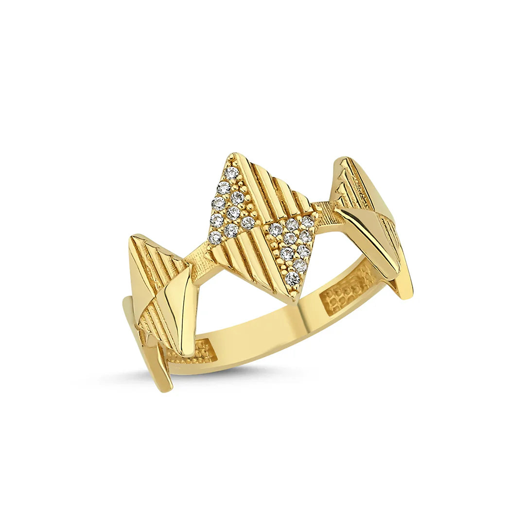 Make a bold and brilliant statement with this 14K gold geometric pyramid ring. Designed with three striking pyramid shapes, this piece mixes sculptural texture with pavé-set sparkle for an edgy yet refined finish.
