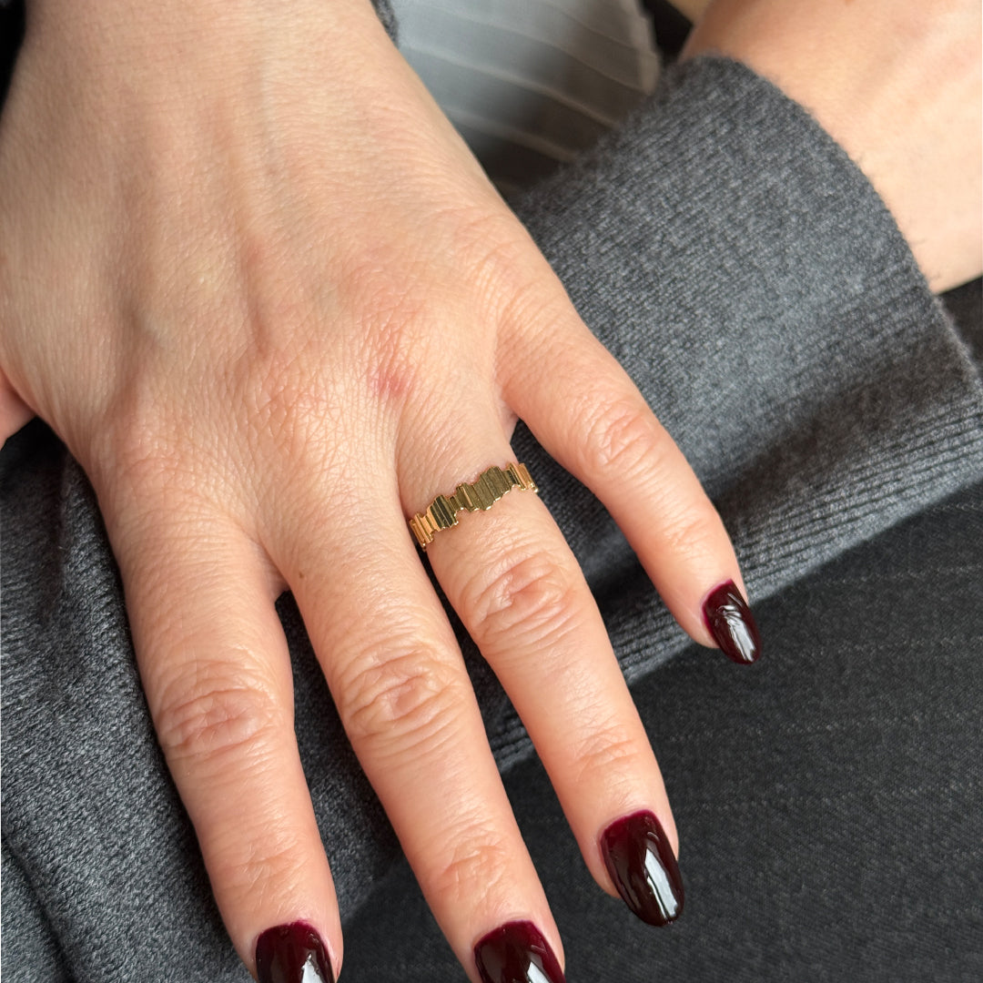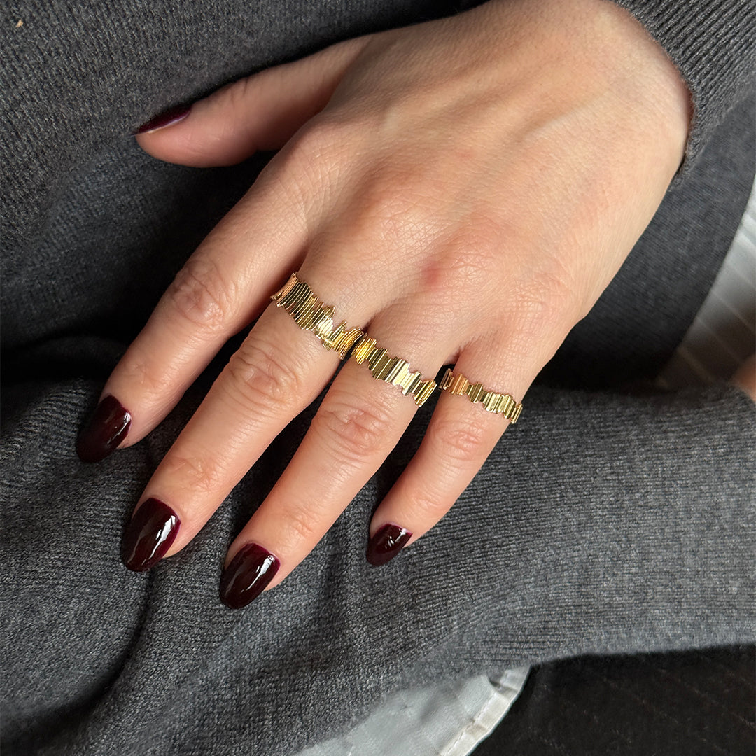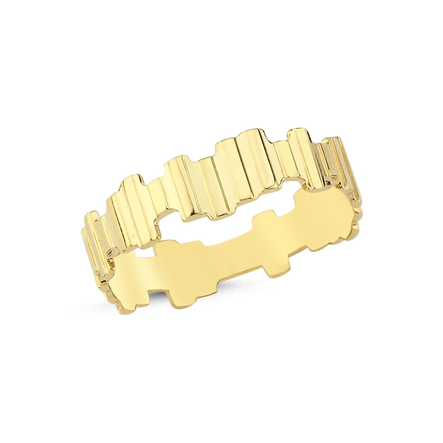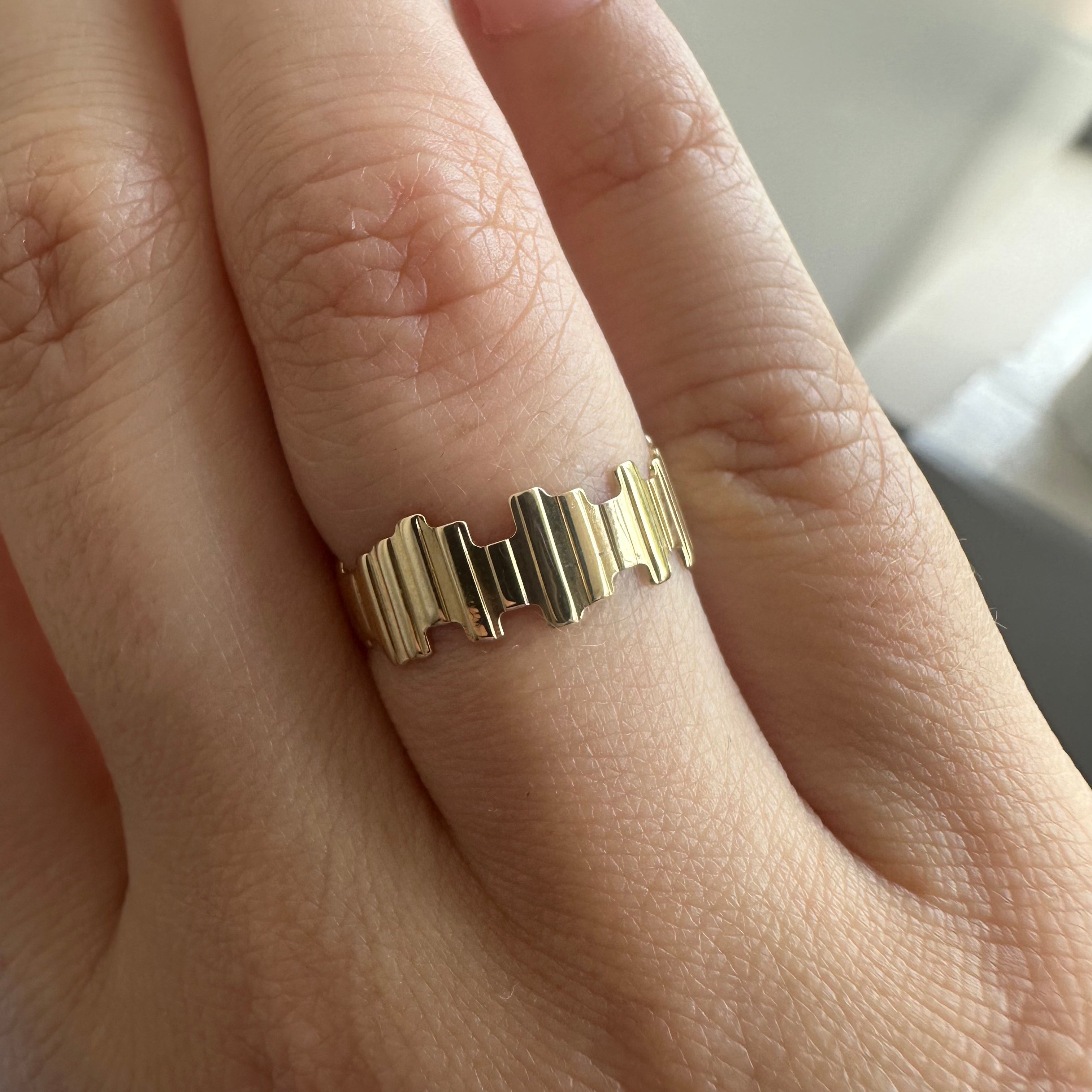 Make a bold impression with this 14K gold geometric band ring. Featuring a sculptural, architectural design, it’s a standout piece that brings strength and style to your everyday stack.
