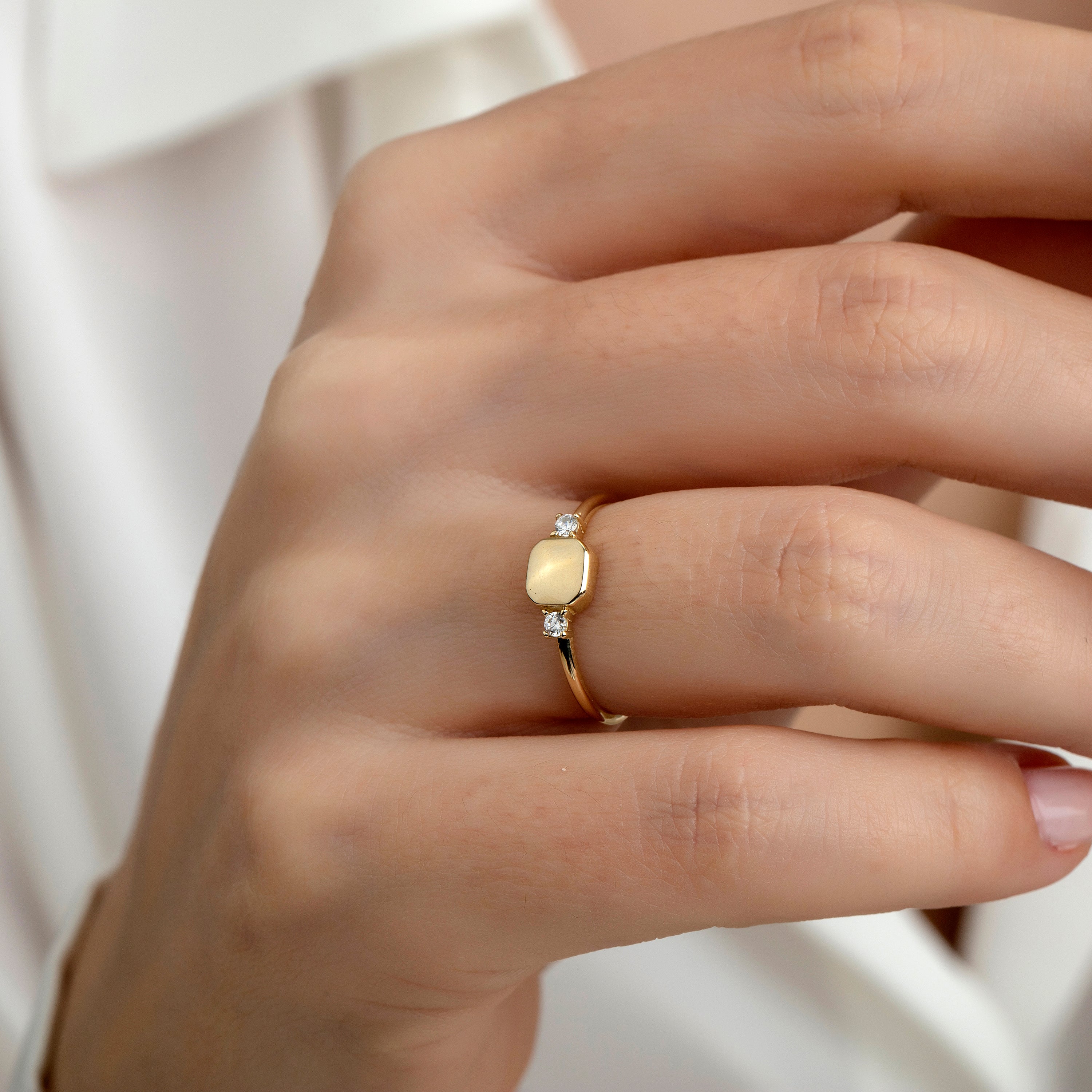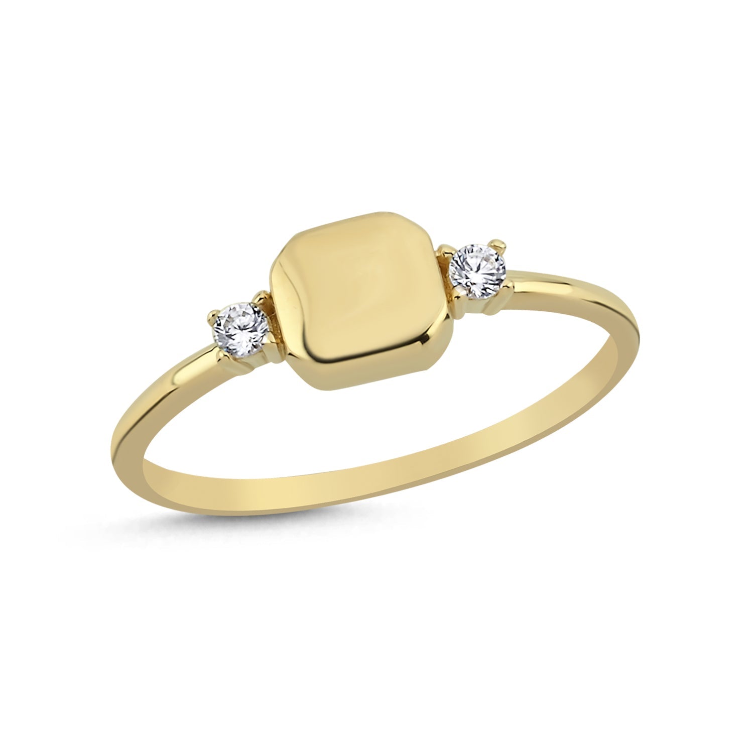 Discover sleek simplicity with this 14K gold stackable ring featuring a soft-edged square centerpiece flanked by two brilliant stones. A perfect blend of symmetry and shine, it's ideal for daily wear or thoughtful gifting.