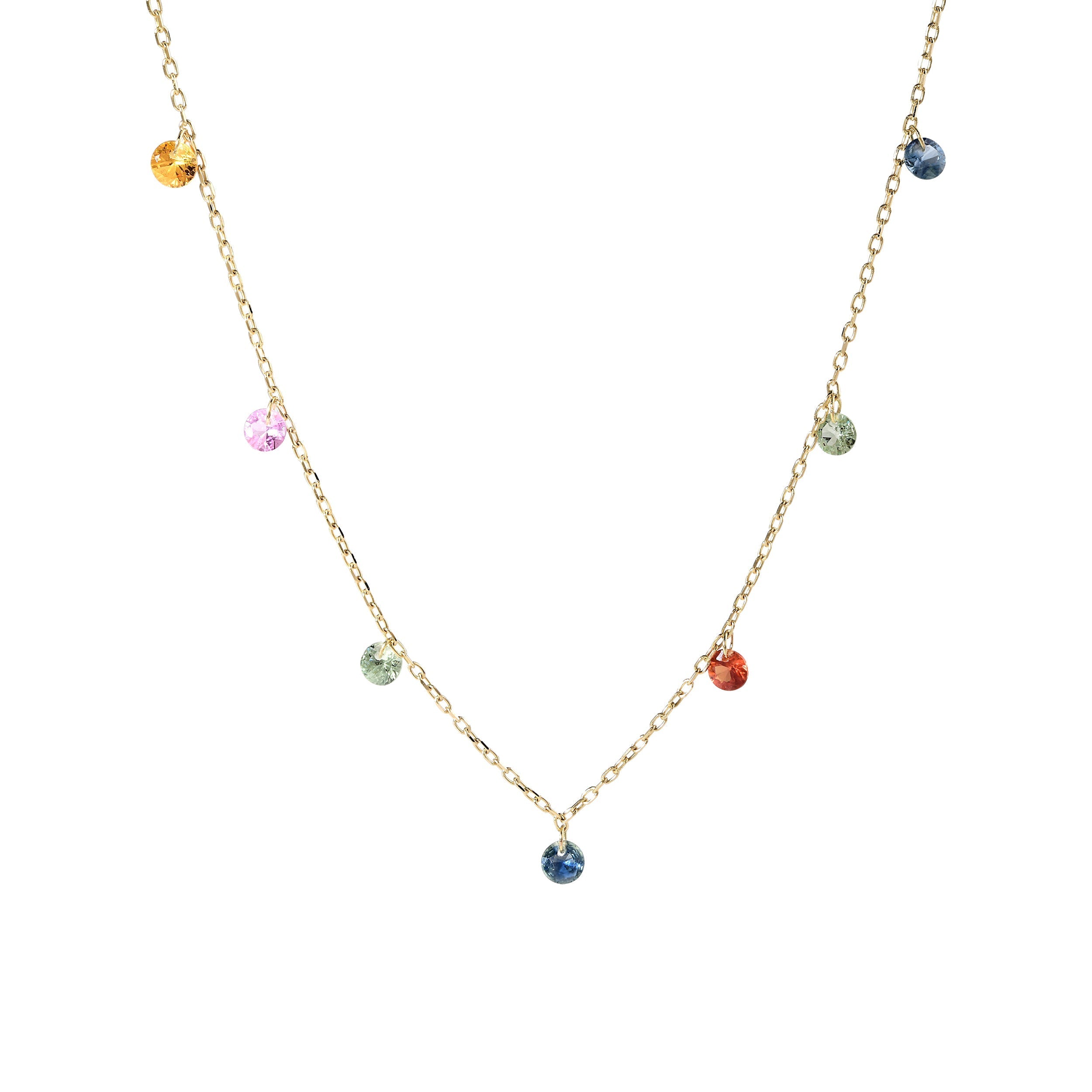 Radiate with color and elegance with this 14K Gold Multi-Sapphire Necklace, a dazzling celebration of vibrant beauty. Featuring delicately suspended sapphires in a spectrum of hues, this necklace sparkles with every movement, bringing a playful yet sophisticated charm to your look. Crafted in genuine 14K gold, this exquisite piece is a must-have for gemstone lovers.