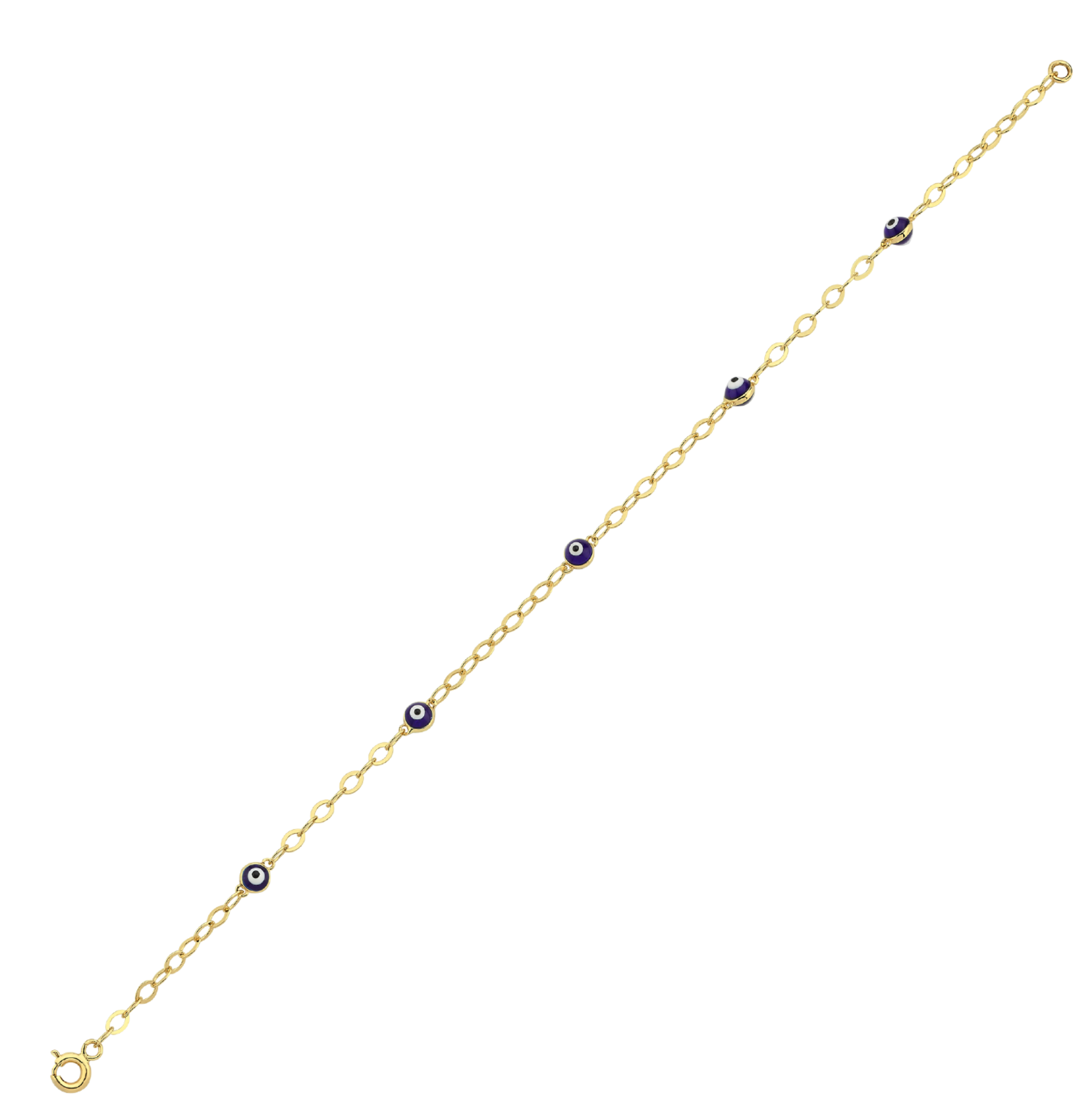 A symbol of positivity and style, this 14K Gold Blue Evil Eye Bracelet is designed to protect and uplift. Featuring delicate evil eye charms on a fine gold chain, it's the perfect balance of fashion and spirituality.