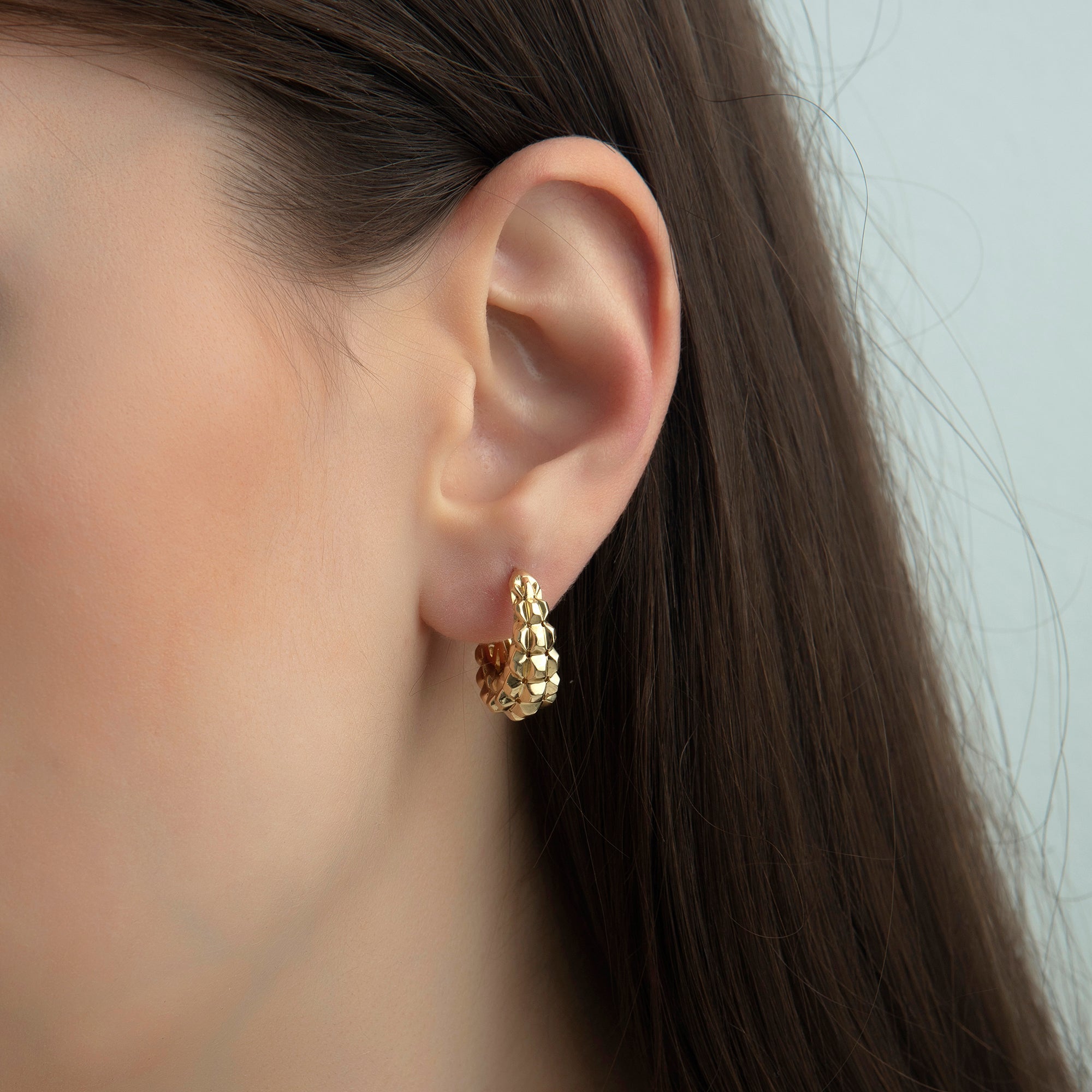 Make a statement with these 14K Gold Textured Pangolin Hoop Earrings, inspired by the intricate scales of the pangolin. The textured, overlapping design reflects light beautifully, creating a bold yet refined look.