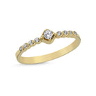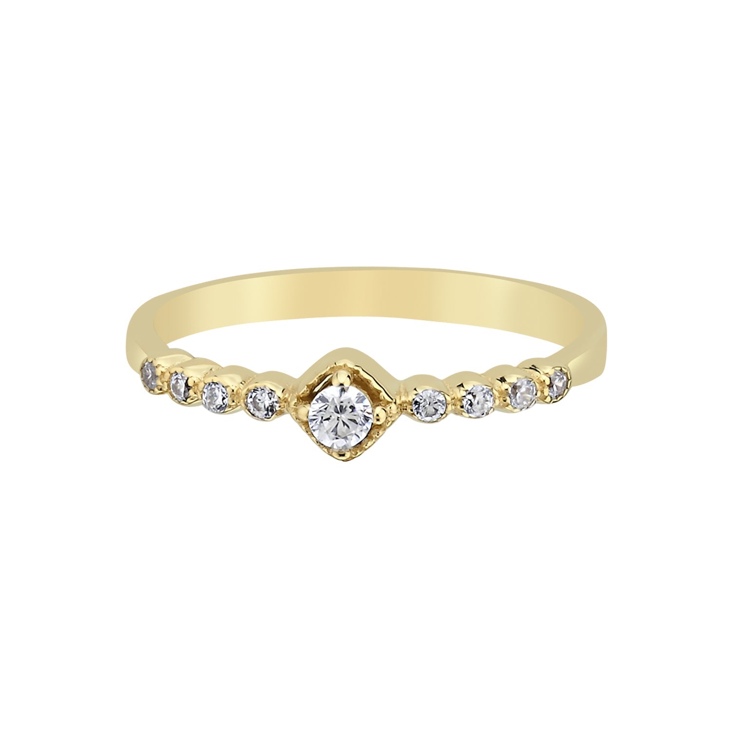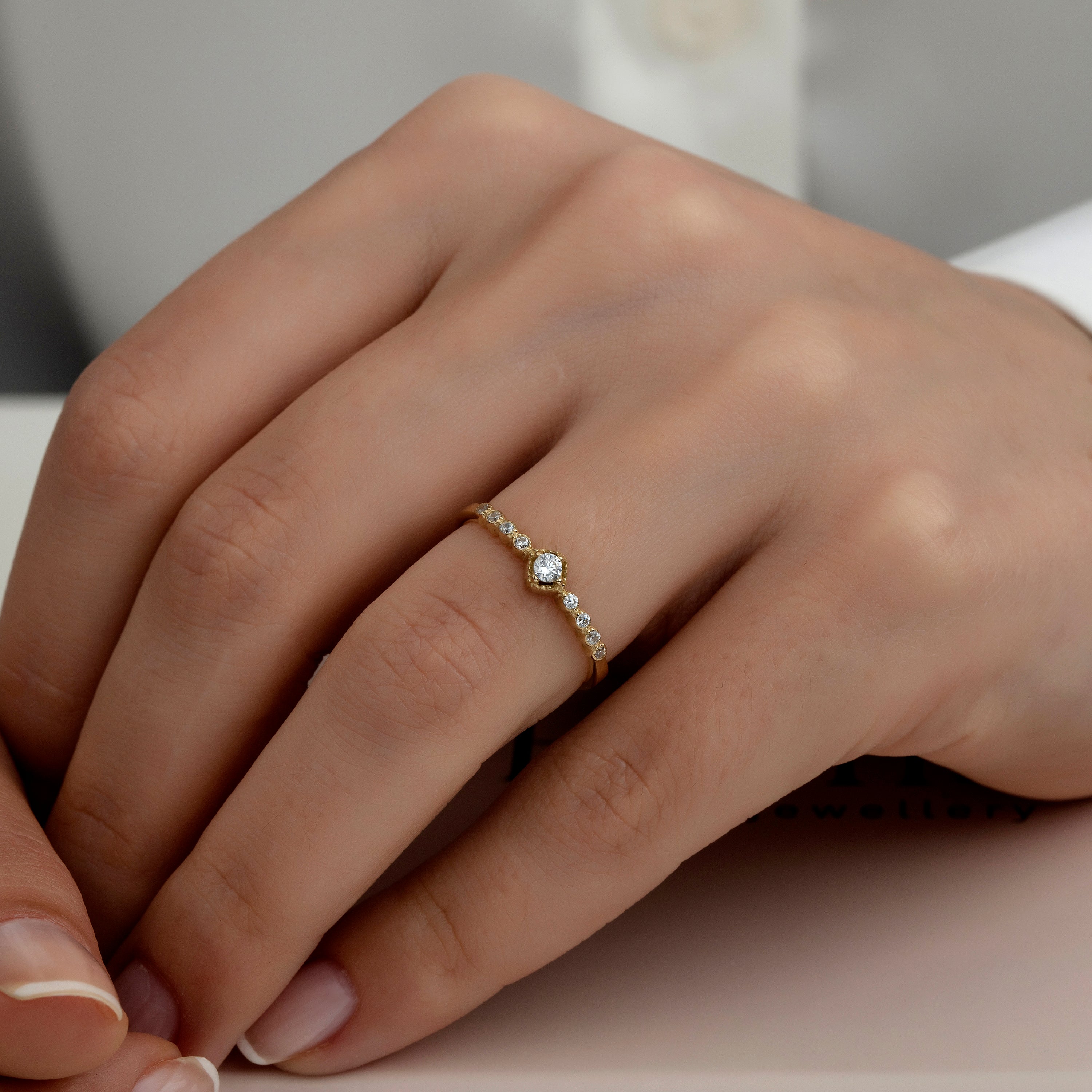 Embrace classic sparkle with this 14K gold dainty stackable ring, featuring a brilliant center stone flanked by a line of glittering accents. Designed for modern layering or solo elegance, it’s a must-have for your fine jewelry collection.