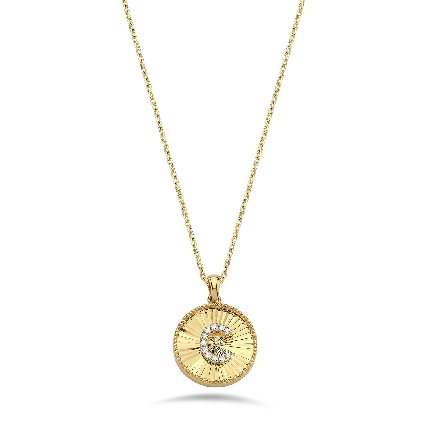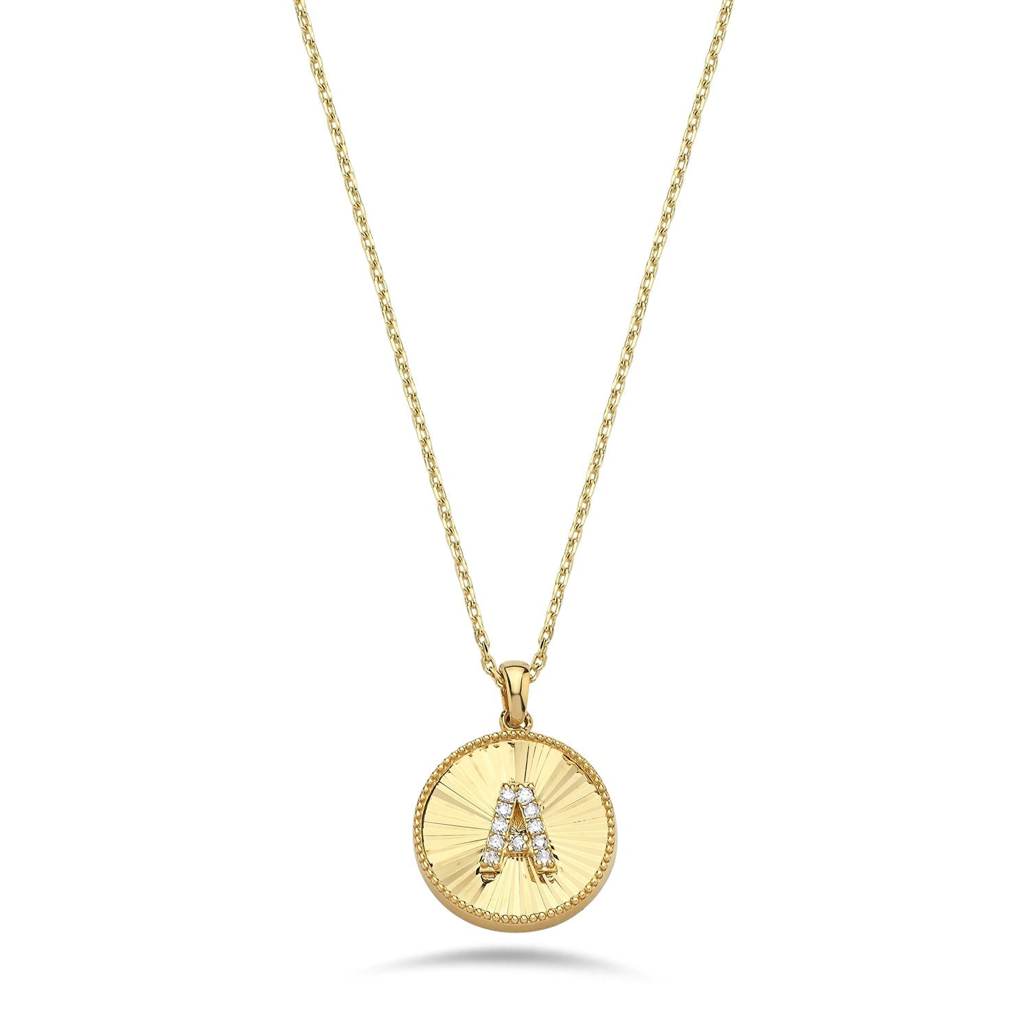 - Round disc pendant with a diamond initial and a delicate sunburst texture