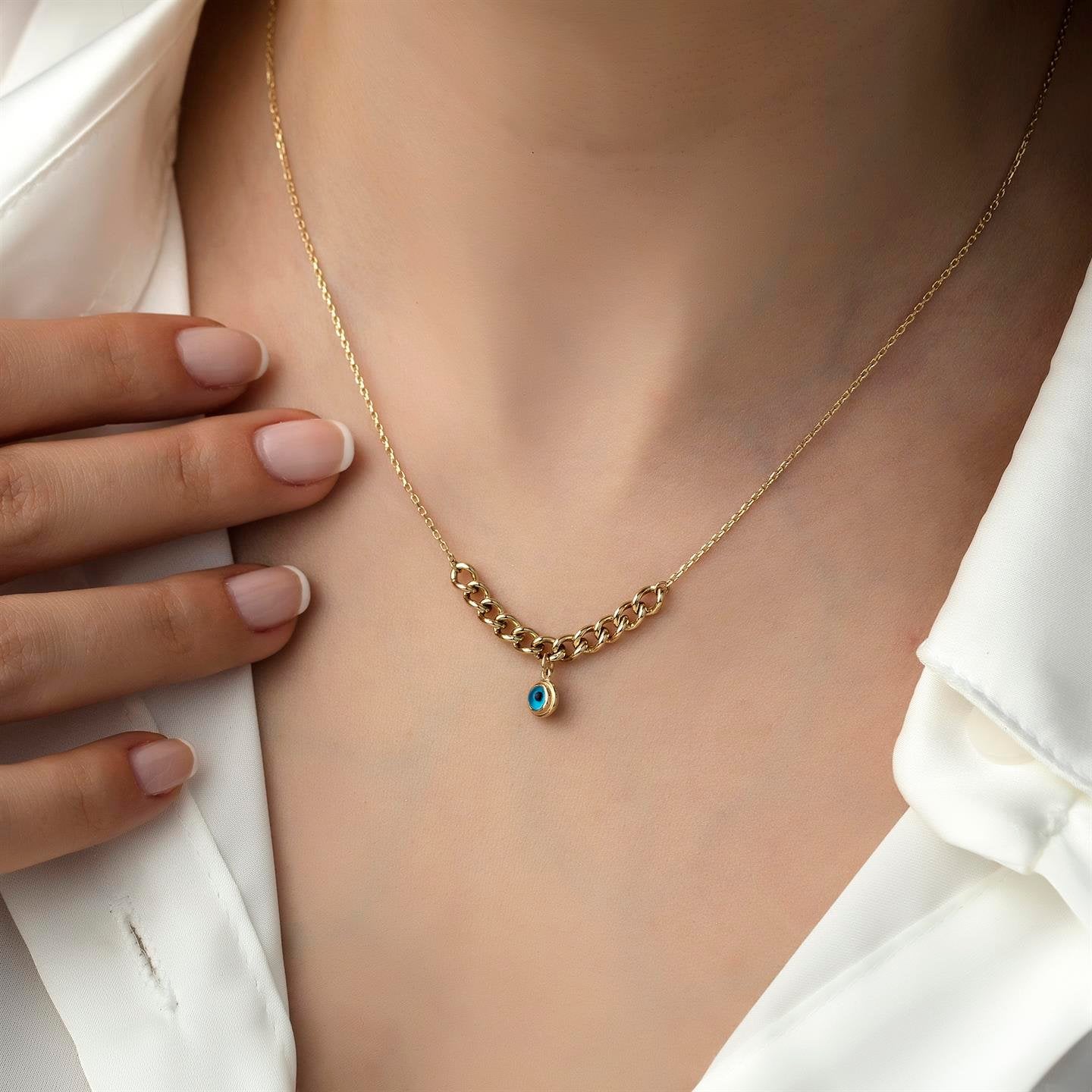 - Bold gourmet chain with a delicate evil eye charm for a unique and meaningful look