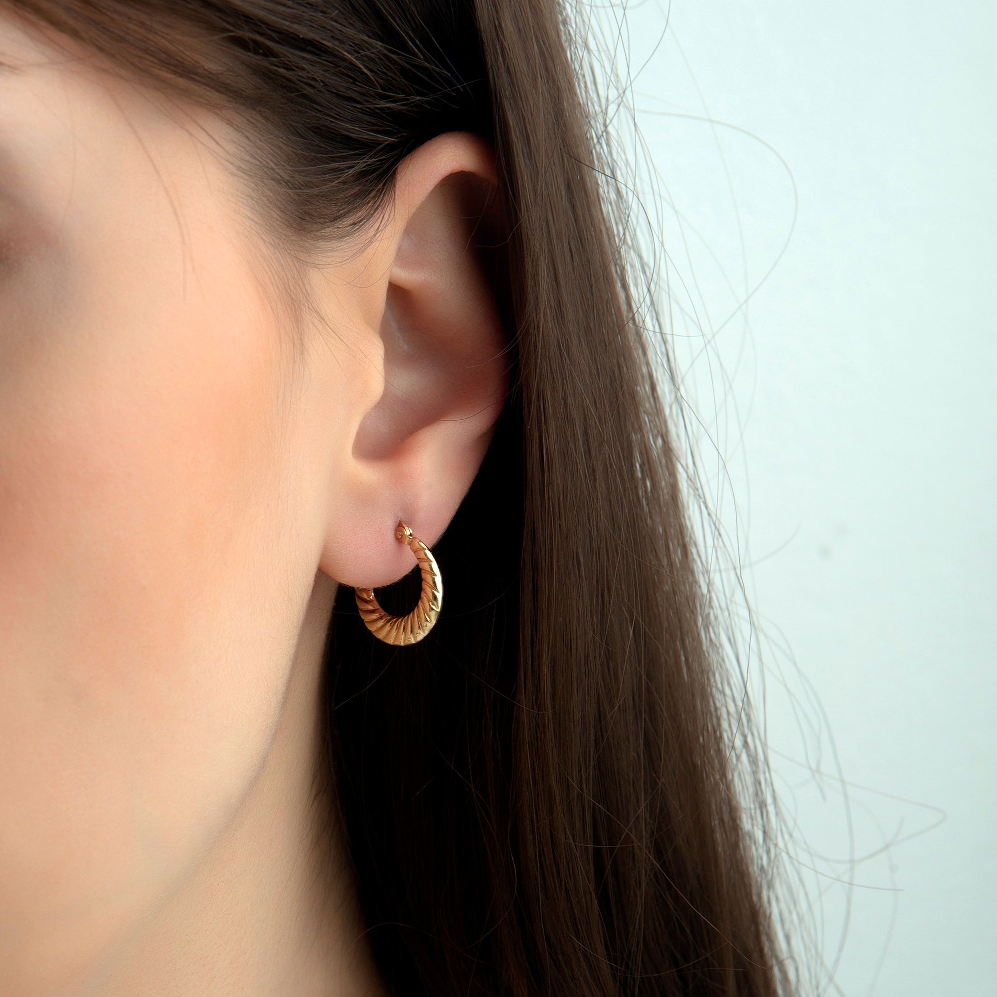 Add a modern twist to your style with these 14K Gold Twisted Snail Hoop Earrings. The intricate spiral design mimics a delicate snail shell, creating a textured and eye-catching look.