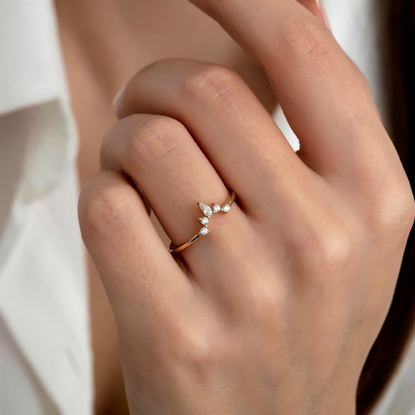 - Teardrop-cut center stone surrounded by round accents, creating a balanced, crown-inspired silhouette.