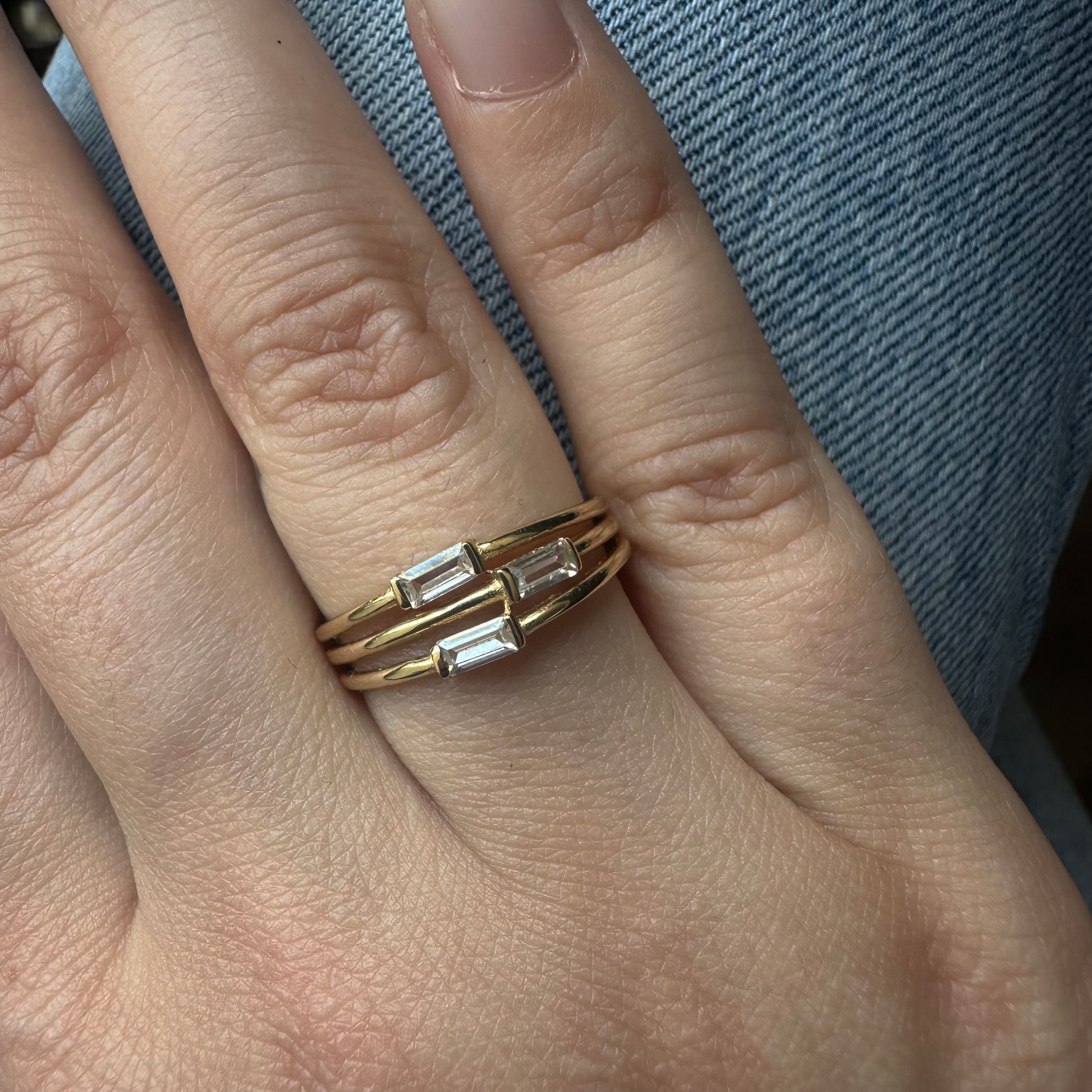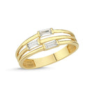Sleek and sophisticated, this 14K Gold Triple Baguette Bar Ring combines modern style with classic elegance. Three baguette-cut stones are precisely set along parallel gold bands, creating a refined and structured design that catches the light beautifully.