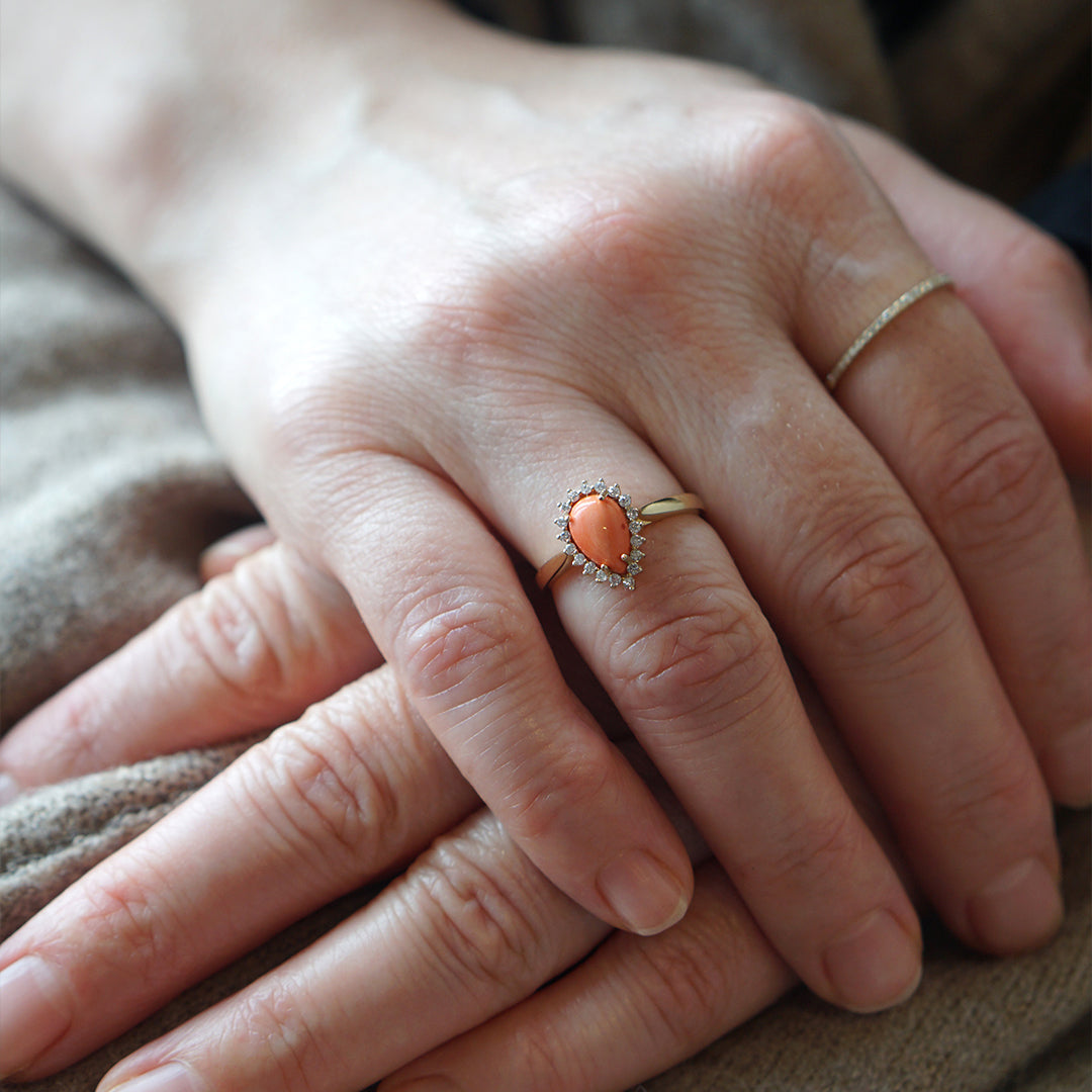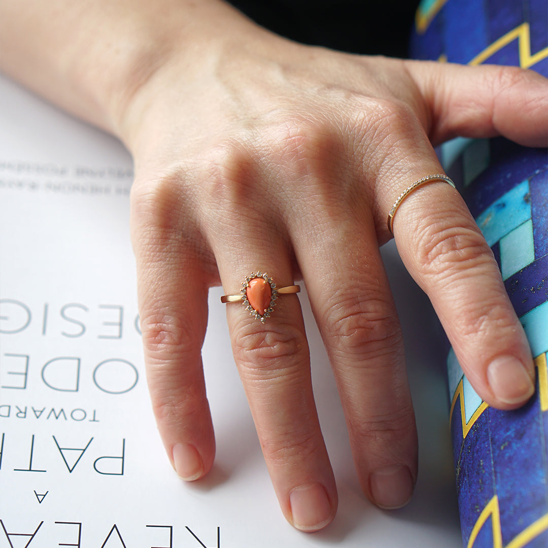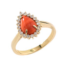 Make a bold and radiant statement with this 14K gold coral ring, beautifully accented with a diamond halo. Featuring a pear-shaped coral gemstone at its heart and surrounded by a glittering array of diamonds, this design merges timeless elegance with organic vibrance.