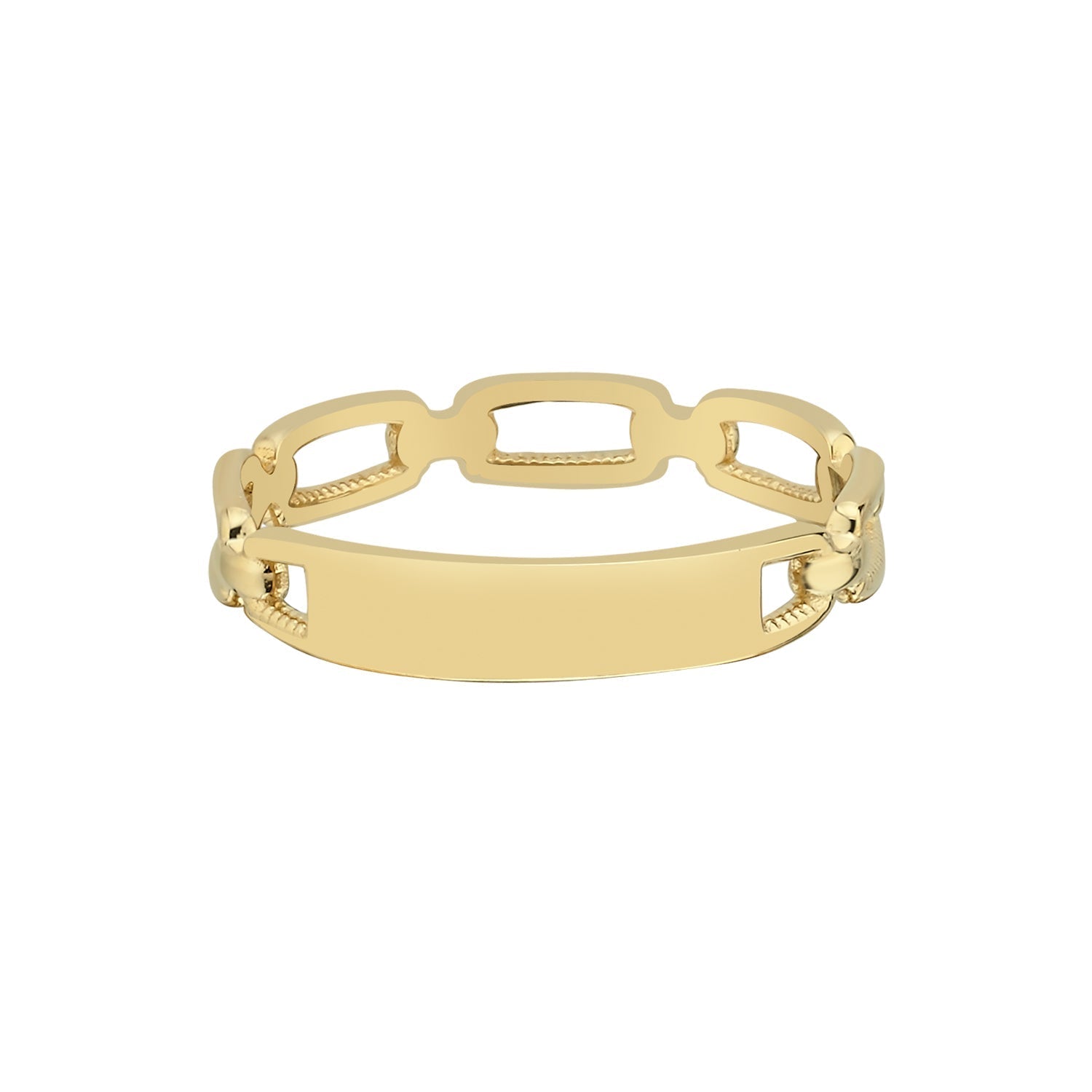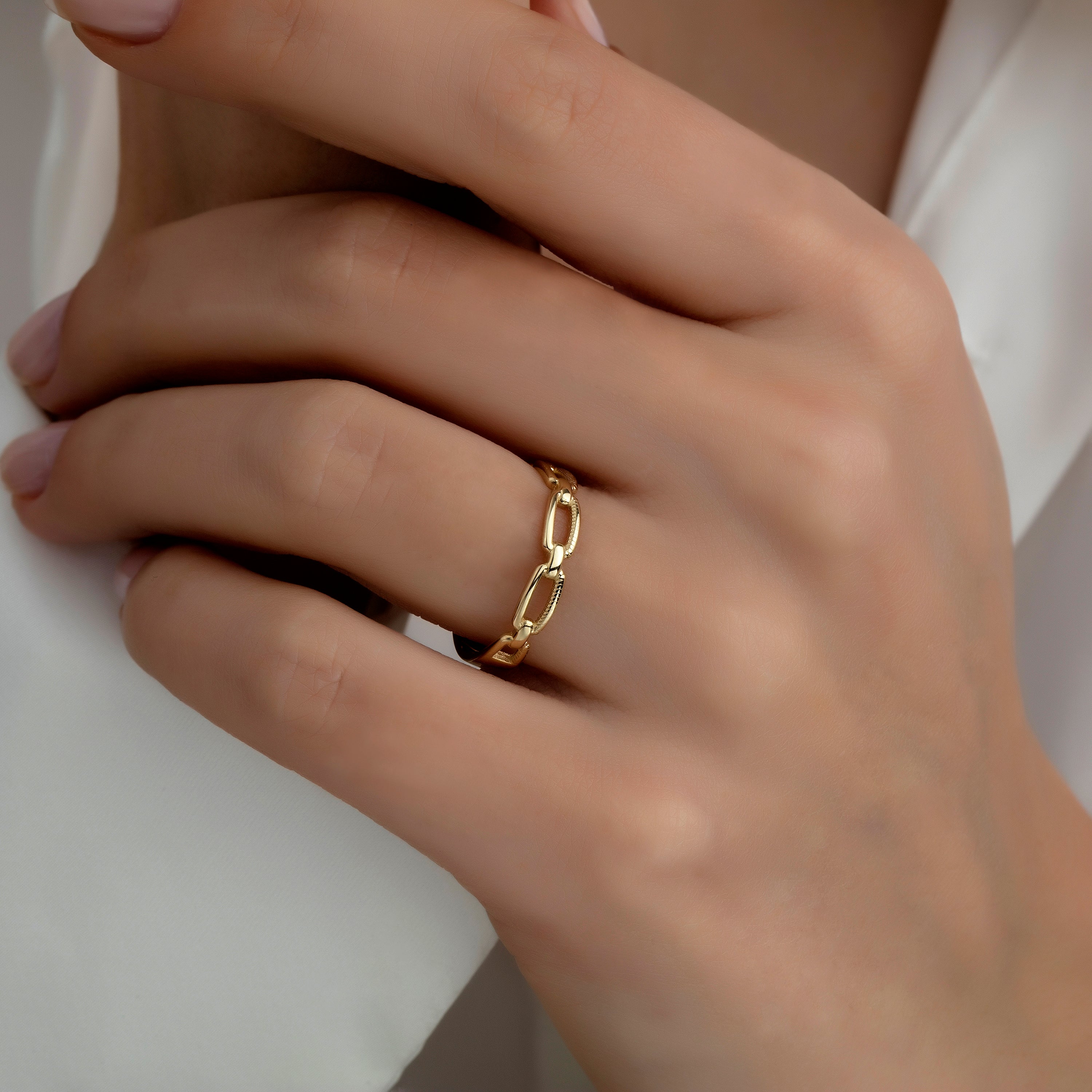 Bold yet refined, this 14K gold chain link ring brings a fresh edge to your stack. Featuring alternating polished and textured links, this statement piece combines structure with subtle detailing, perfect for solo wear or stacking with your favorite bands.