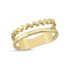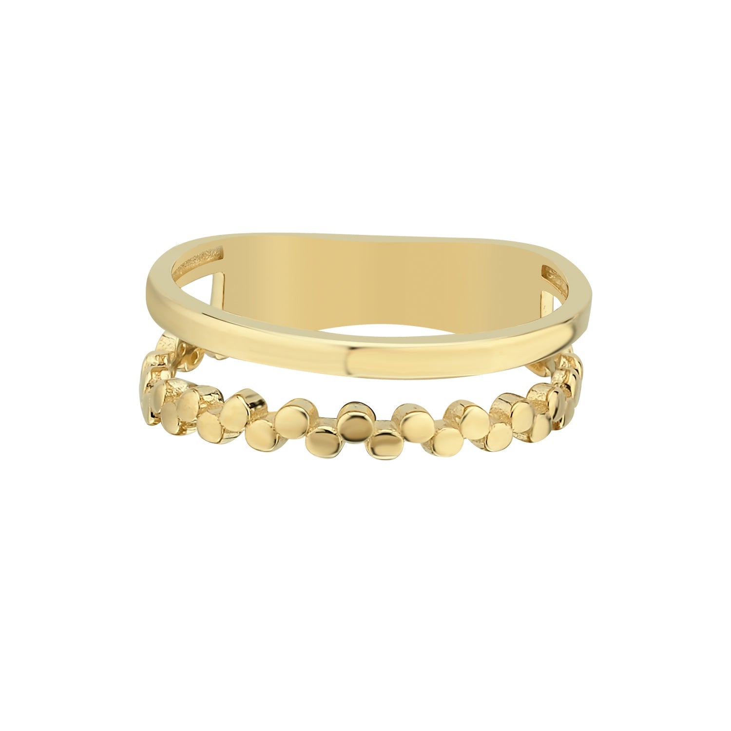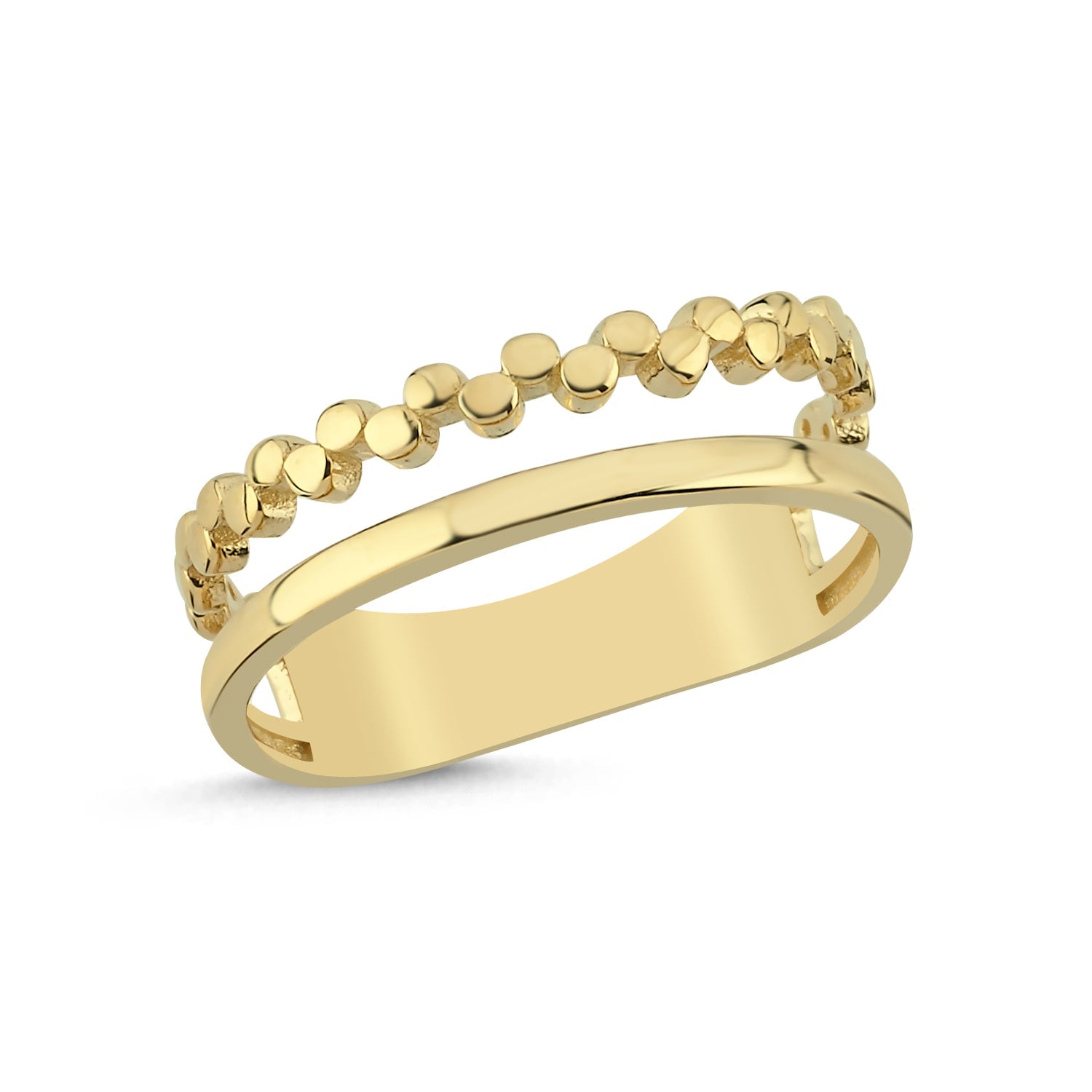 Make a modern statement with this 14K gold double band ring that pairs bold structure with refined texture. The lower polished band offers sleek simplicity, while the upper dotted band adds playful detail, together creating an effortlessly layered look in one elegant piece.