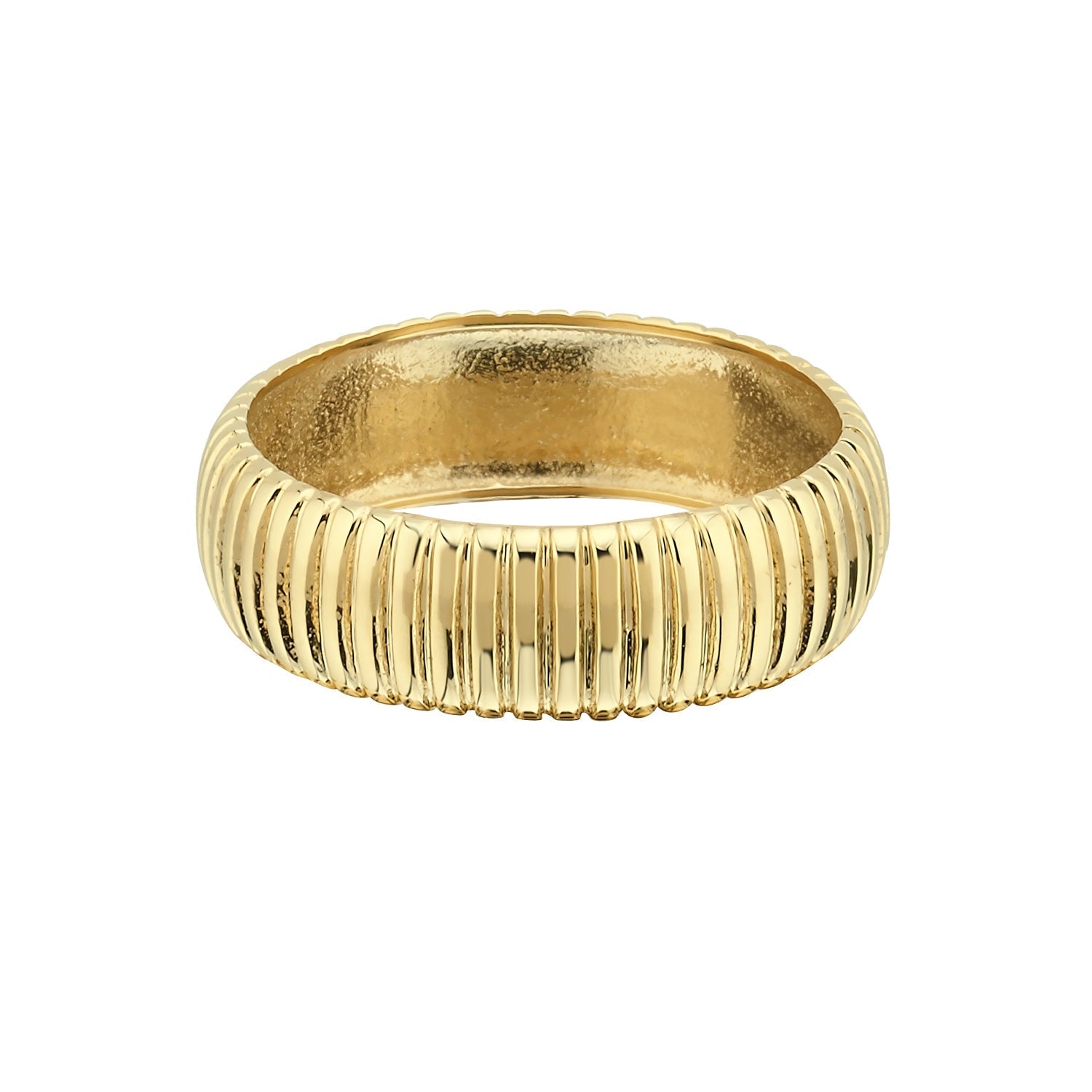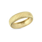 Make a bold and timeless impression with this 14K gold ribbed dome ring. Its wide profile and raised rib texture bring a modern edge to classic design, making it a striking choice for everyday confidence or elevated style.