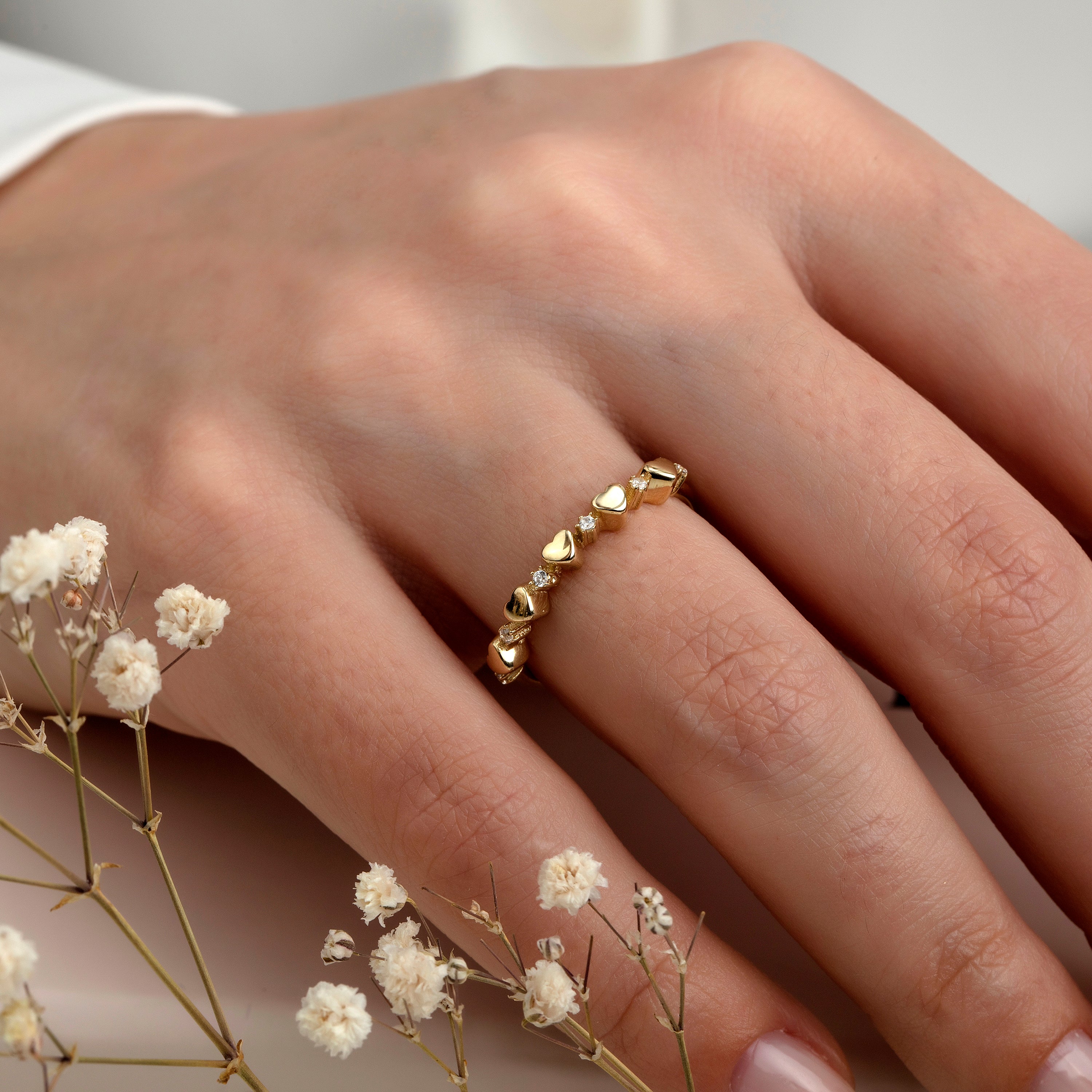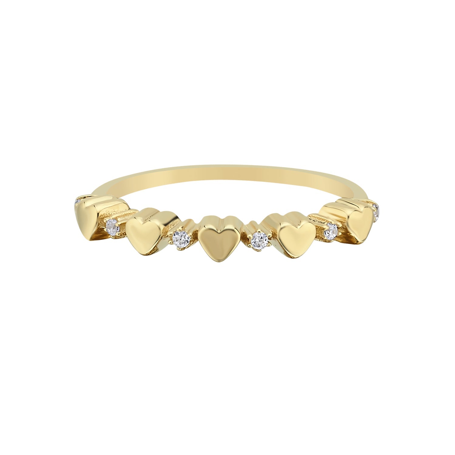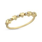 Celebrate love and sparkle with this charming 14K gold heart ring. Alternating heart motifs and glittering stones form a delicate band that radiates romance and elegance, perfect for stacking or standing alone.