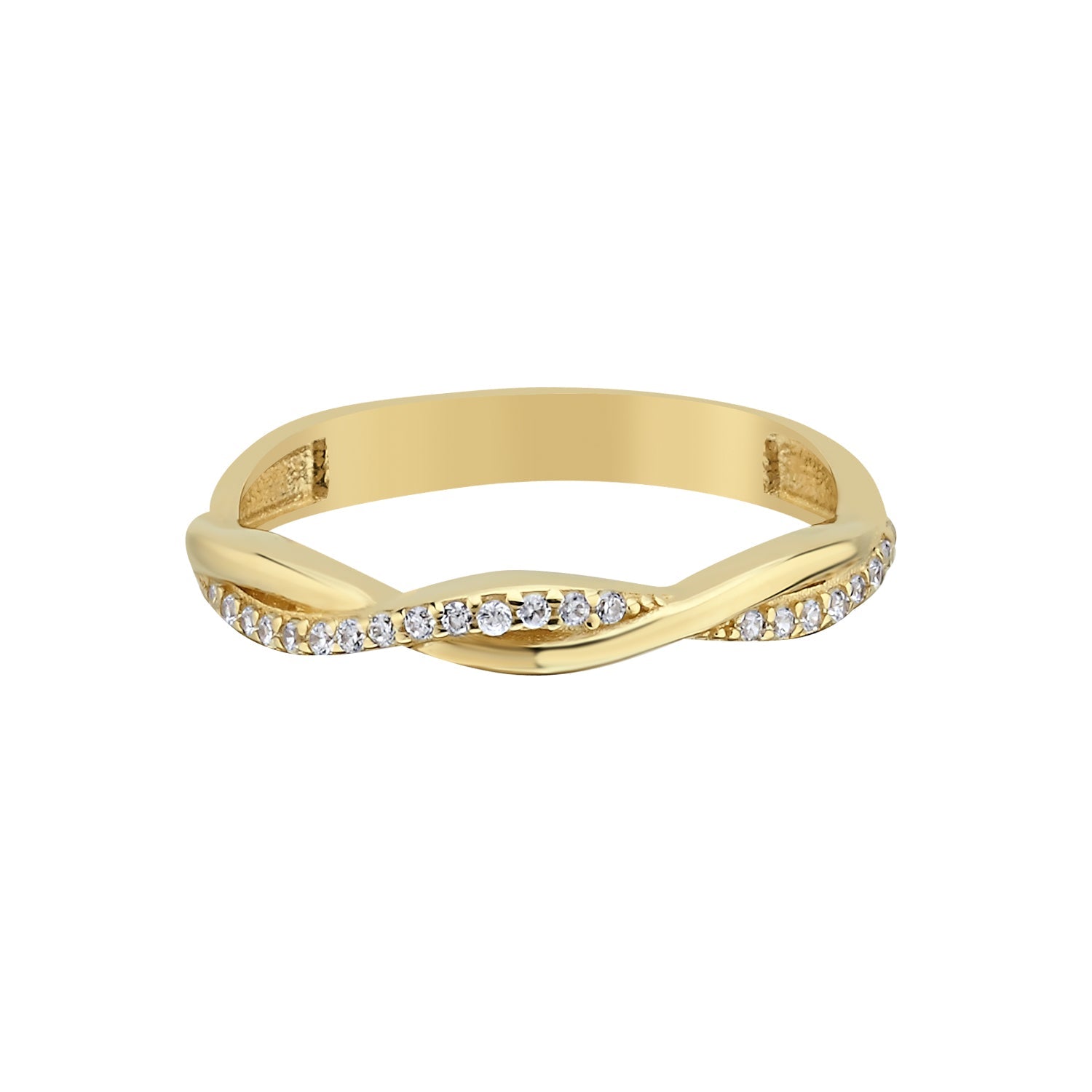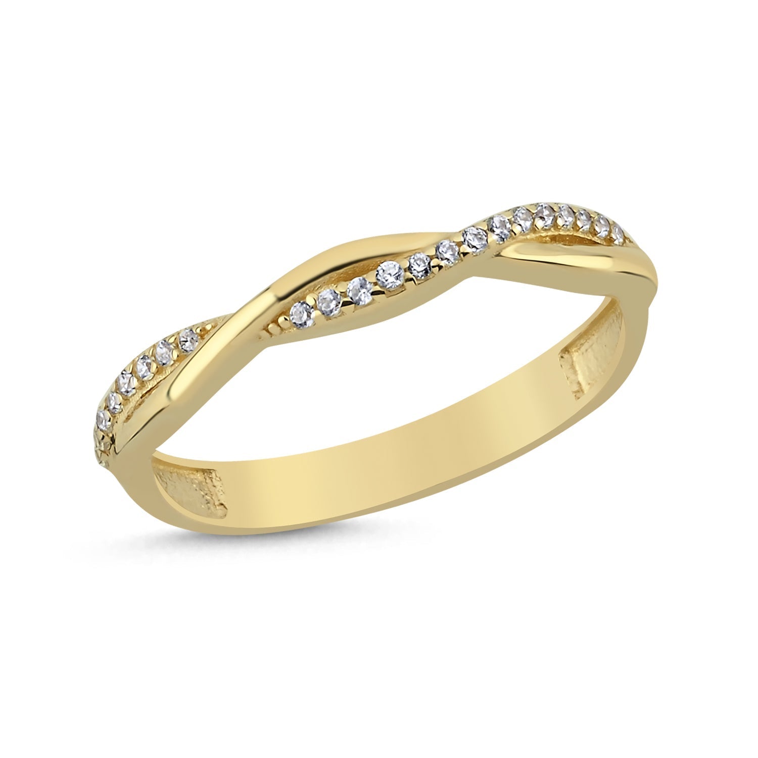 Add a sculptural shimmer to your collection with this 14K gold twist ring. Adorned with a row of sparkling stones that follow the flowing curve of the band, this design merges fluidity with radiance in one delicate piece.