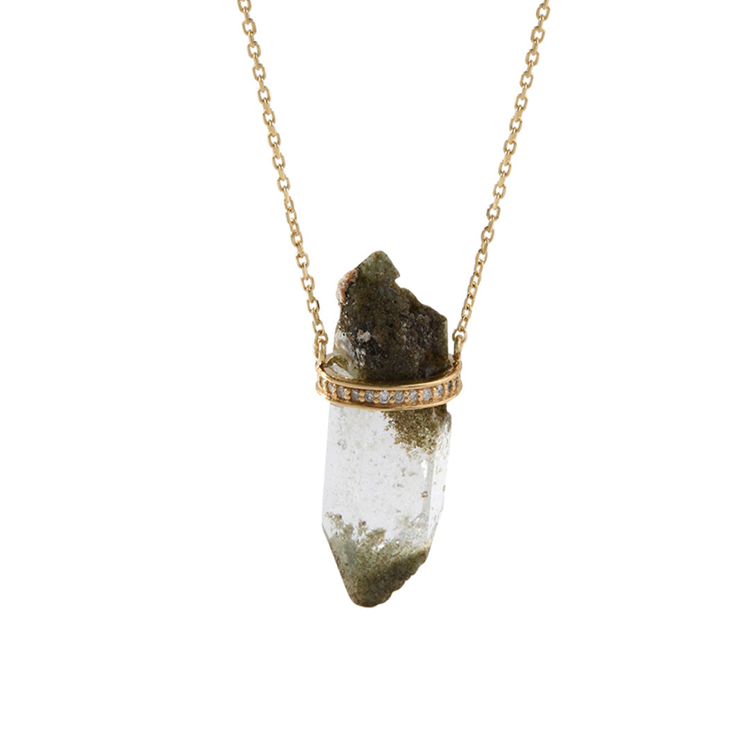 18K Gold Raw Green Quartz & Diamond Necklace /1